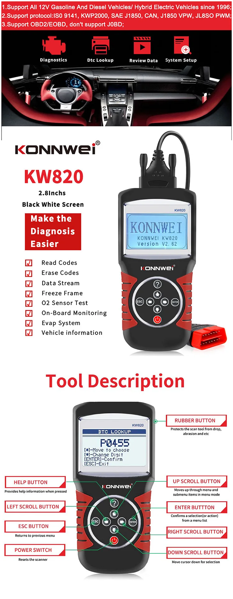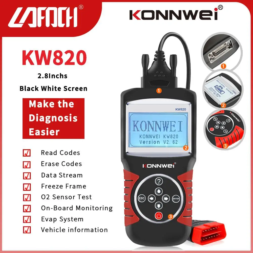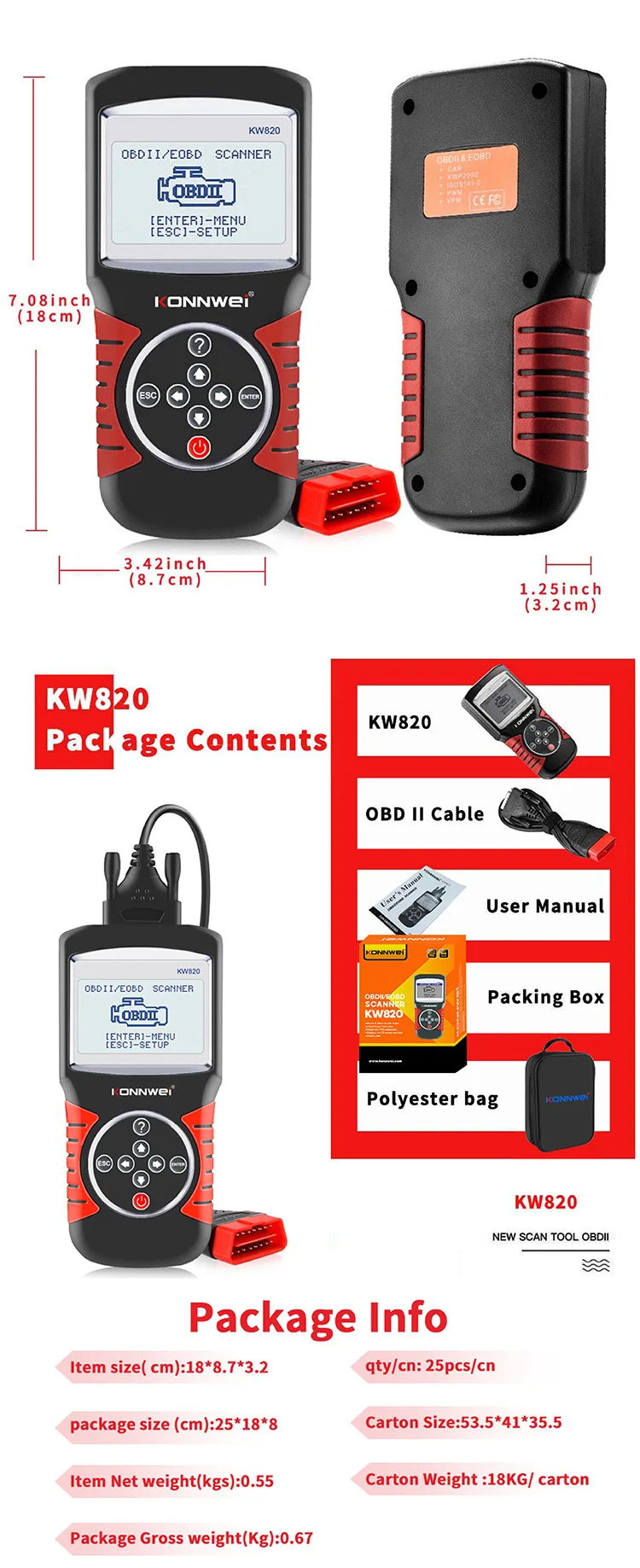 Краткое описание KONNWEI KW820: Считыватель кодов KW820 OBDII/EOBD поддерживает все Девять режимов тестирования OBDII на всех транспортных средствах OBDII EOBD, чтобы позволить техническим специалистам и домашним пользователям точно диагностировать даже самые сложные проблемы. Сложный, но простой в использовании, этот ручной сканирующий инструмент обеспечивает быстрый и легкий доступ к кодам неисправностей EOBD на основе двигателя, инструмент с поддержкой CAN дает ясность, лаконичные определения DTC на большом ЖК-экране с подсветкой извлекают общие коды P0, P2 и P3 и U0 для выбросов двигателя, а также подбирают специфические для производителя P1, Коды P3 и U1, отключает свет MIL, сохраняет данные стоп-кадра для последующей оценки, а также отображает статус готовности монитора и I/M.