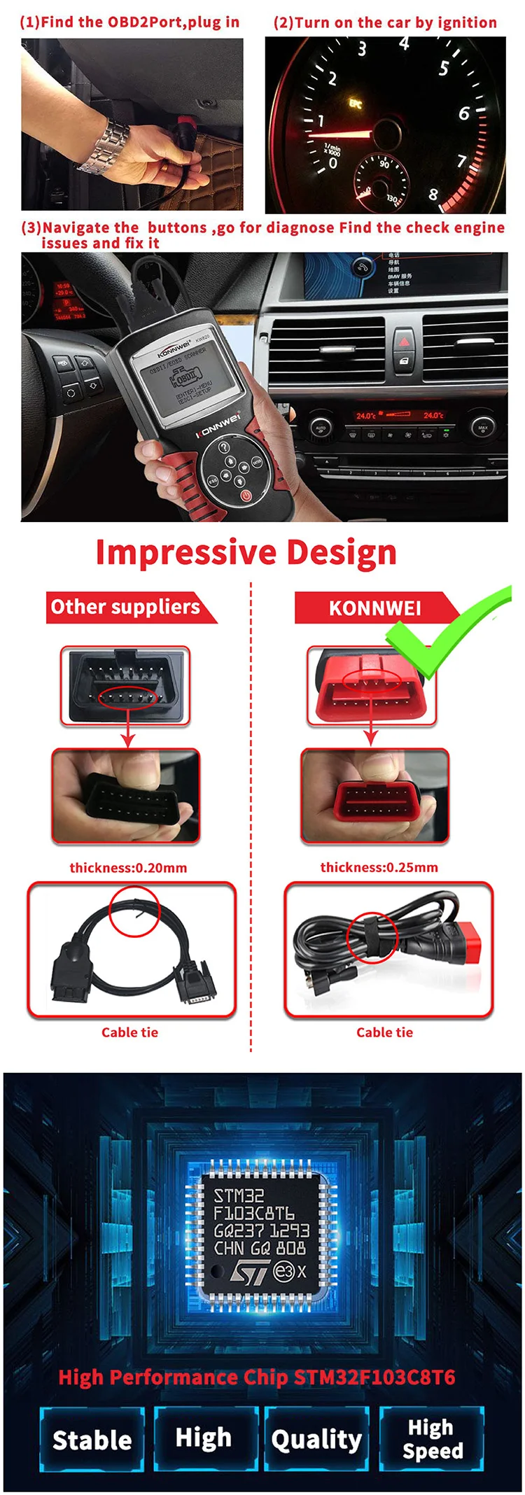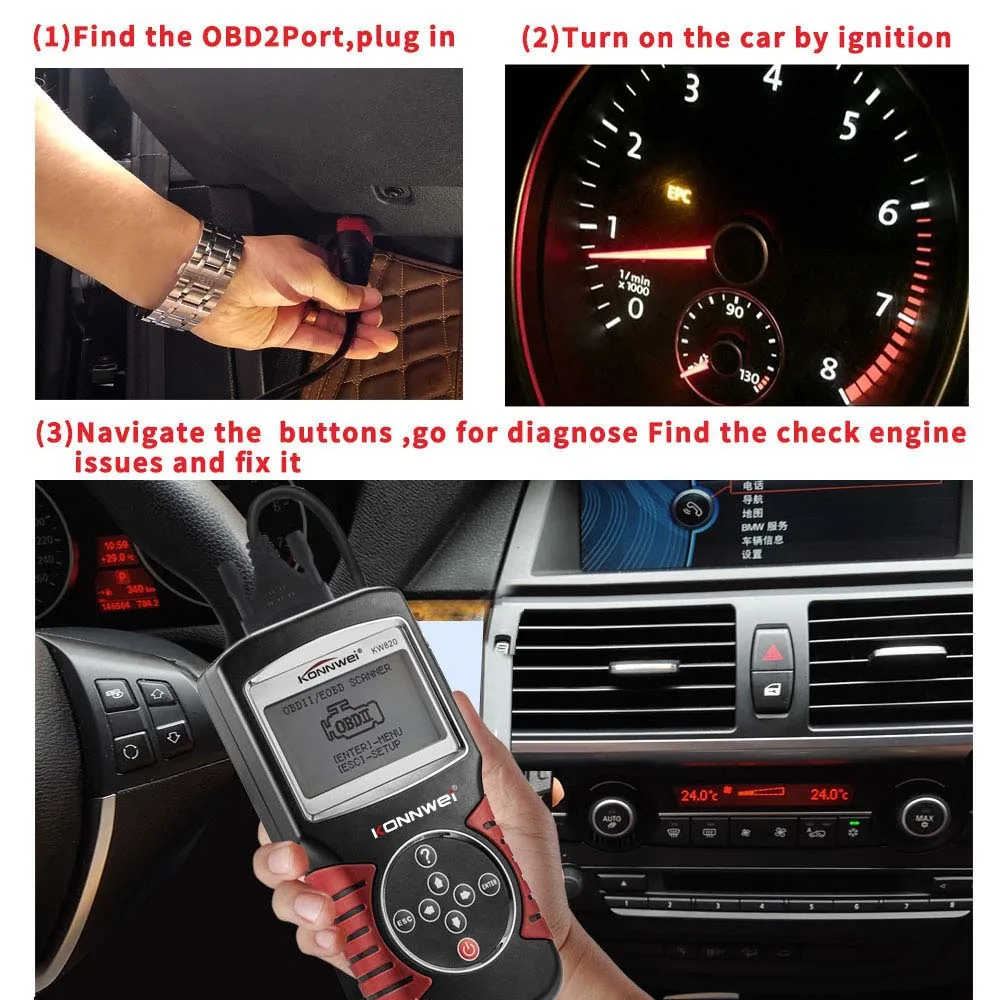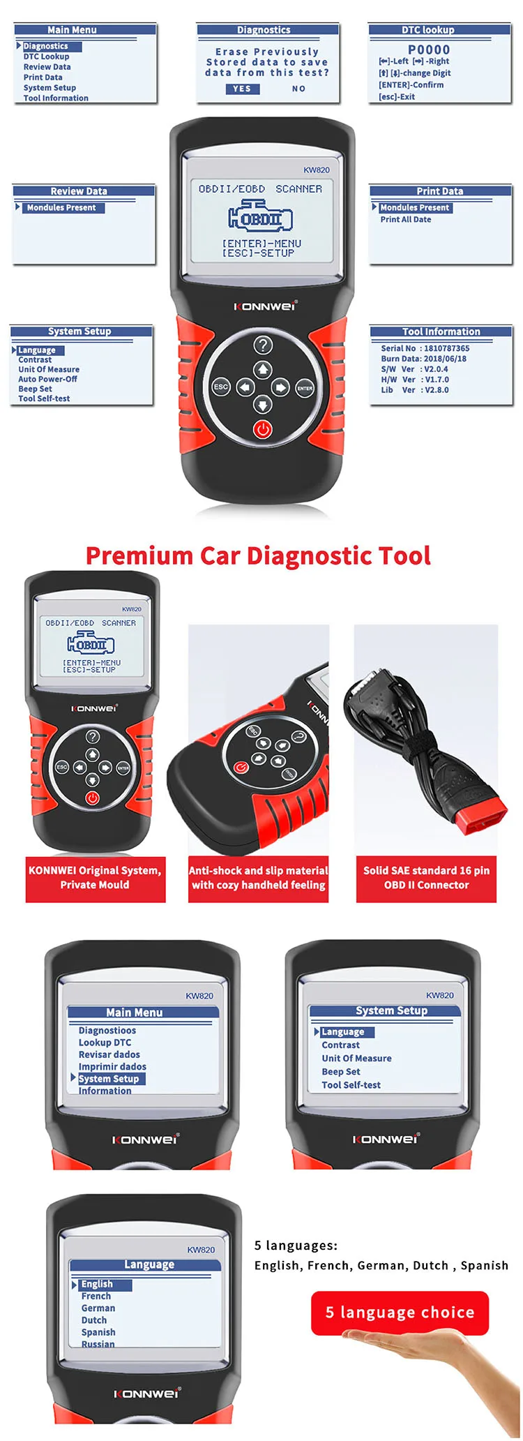 Краткое описание KONNWEI KW820: Считыватель кодов KW820 OBDII/EOBD поддерживает все Девять режимов тестирования OBDII на всех транспортных средствах OBDII EOBD, чтобы позволить техническим специалистам и домашним пользователям точно диагностировать даже самые сложные проблемы. Сложный, но простой в использовании, этот ручной сканирующий инструмент обеспечивает быстрый и легкий доступ к кодам неисправностей EOBD на основе двигателя, инструмент с поддержкой CAN дает ясность, лаконичные определения DTC на большом ЖК-экране с подсветкой извлекают общие коды P0, P2 и P3 и U0 для выбросов двигателя, а также подбирают специфические для производителя P1, Коды P3 и U1, отключает свет MIL, сохраняет данные стоп-кадра для последующей оценки, а также отображает статус готовности монитора и I/M.