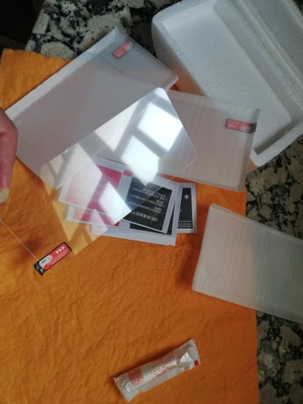 Доставка за 2 недели, стёкла с неплохим покрытием, из-за небольшого дефекта в верхнем правом углу немного не плотно село, в комплекте тюбик типа фломастера с жижей для заполнения краёв, которого должно хватить как раз думаю для поклейки трёх стёкол.