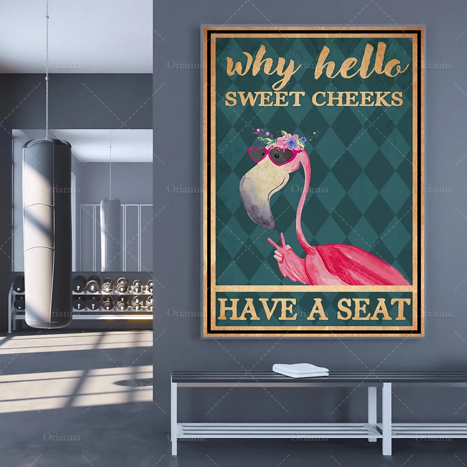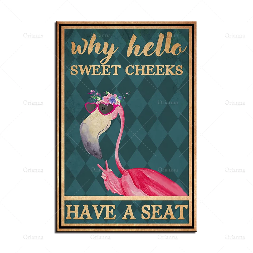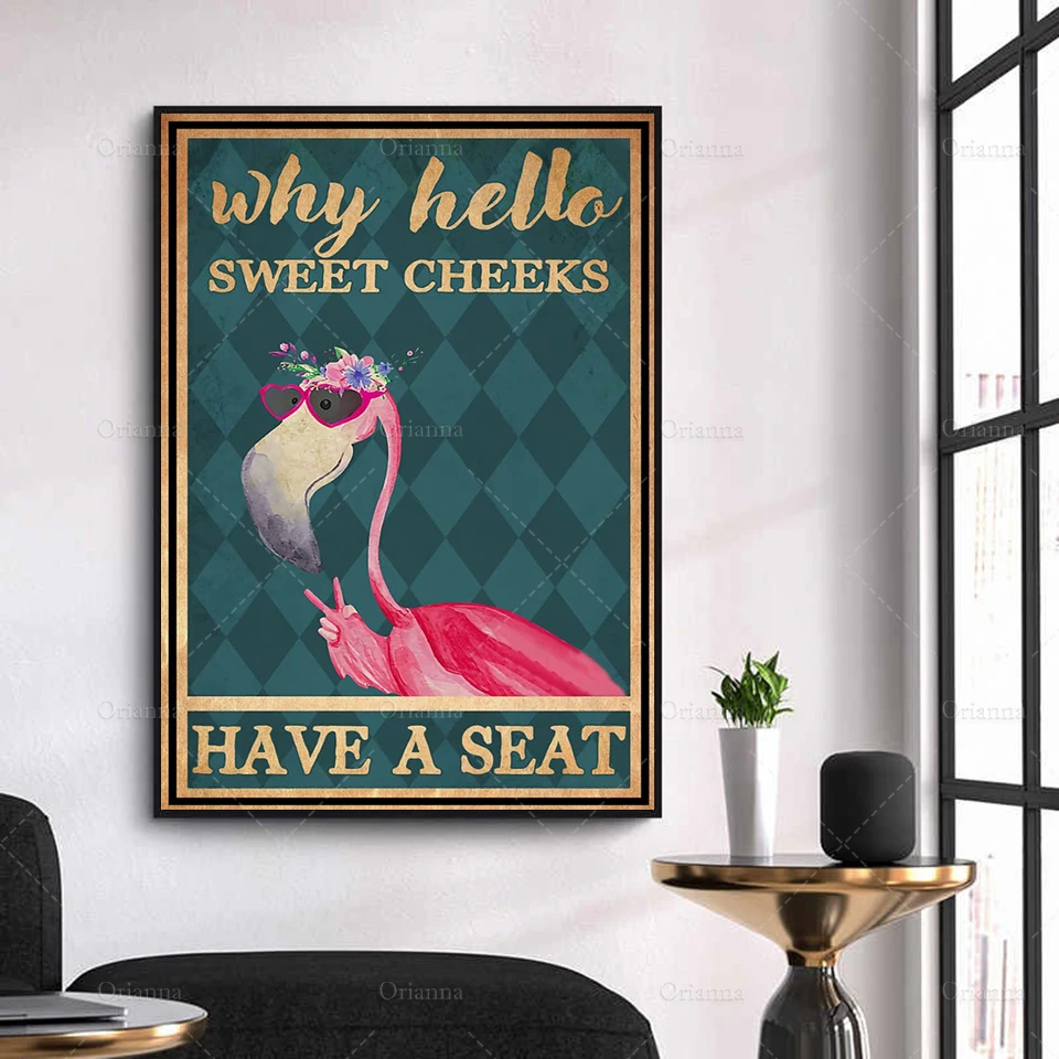 У Why Hello Sweet Cheeks есть постер на сиденье, художественный принт с розовым фламинго, Забавный принт с фламинго, настенное искусство для ванной, лучший подарок,