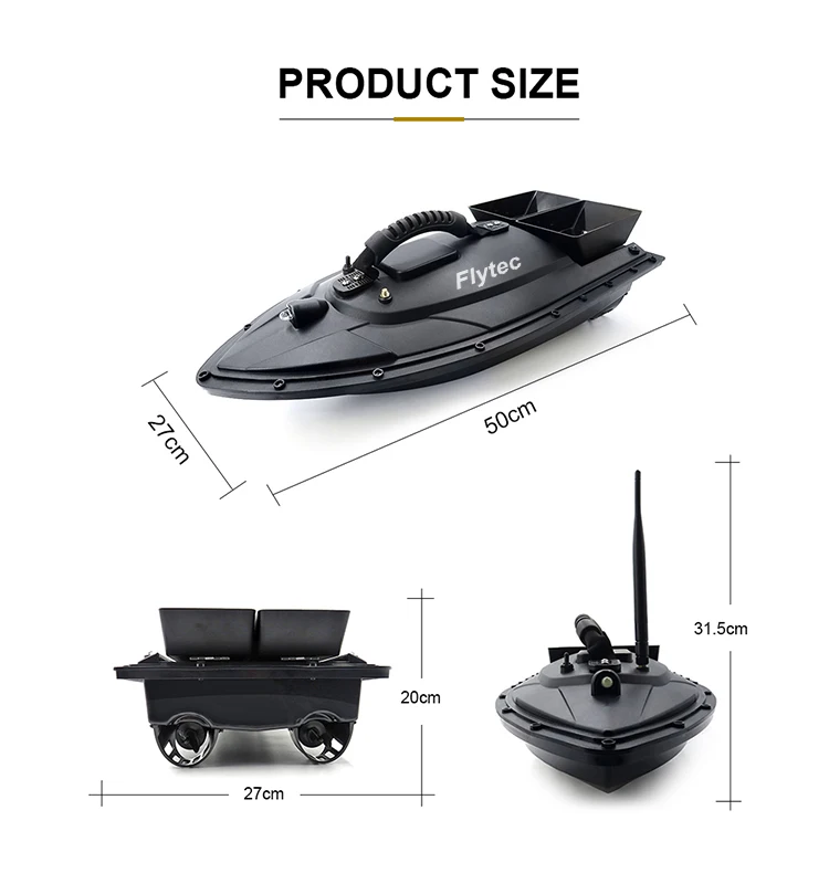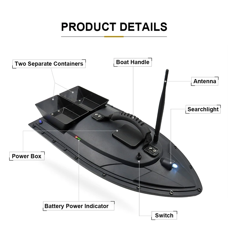 Функции: движение вперед/назад, поворот влево/вправо, купание.Корпус лодки: высококачественный материал ABS для литья под давлением, более стабильный и прочный, который может противостоять сильному ветру и волнам, отличному внешнему виду, тонкому мастерству и качеству.Двойные двигатели: огромная загрузка двух отдельных баков приманки, которые можно контролировать отдельно.Супер большая емкость приманки внутренний бак: Вес-1,5 кг.Дистанция дистанционного управления: 500 м без помех, сигнал более стабильный в чистой среде.Литиевый аккумулятор высокой емкости: который помещается в середину корпуса лодки и более стабильный, может заряжаться более быстро и мощнее.