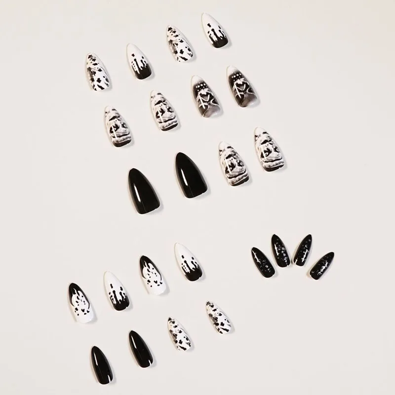 24 шт./компл. в стиле панк с черепом, накладные ногти, предварительно дизайн, черный стилет, полное покрытие, аксессуары для ногтей, накладные ногти с клеем, искусственные губки