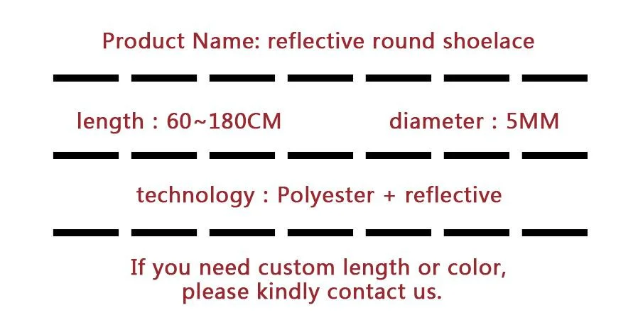 Материал: полиэстер + пластик + Светоотражающая полосаФункция/сочетание/Применение: шнурки для обуви, шнурки для талии, веревки для шляпы и т. д.Цвет/разноцветная комбинация: 17 цветов на выборСпецификация: 60-180 см * 5 ммДиаметр/Ширина: 0,5 смТип формы: круглыйГоловка шнурков: прозрачный пластикВес брутто: 50 гСертификат: Oeko-tex-100,ISO9001,SGS,CEПосылка: 1 пара/opp полиэтиленовый пакетИндивидуальные: цветовое сочетание/длина и ширина/печать логотипа, пожалуйста, свяжитесь с нашей службой поддержки клиентов