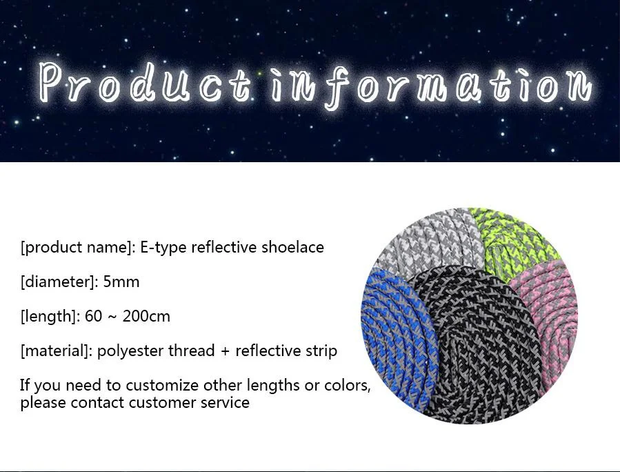 Материал: Светоотражающая полоса + полиэстер + пластик Функция/сочетание/Применение: шнурки для обуви, шнурки для талии, веревки для шляпы и т. д. Сочетание цветов и цветов: 5 цветов на выбор Спецификация: 60-180 см * 5 мм Диаметр/Ширина: 0,5 см Тип формы: круглый Головка шнурков: прозрачный пластик Вес брутто: 50 г Сертификат: Oeko-tex-100,ISO9001,SGS,CE Посылка: 1 пара/opp полиэтиленовый пакет Индивидуальные: цветовое сочетание/длина и ширина/печать логотипа, пожалуйста, свяжитесь с нашей службой поддержки клиентов