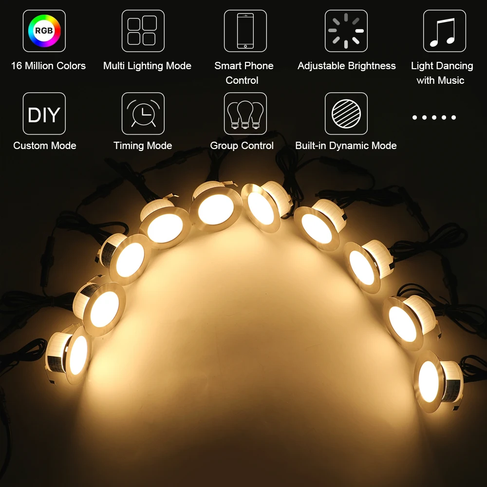 Цвета освещения: RGB RGBWНапряжение: DC12VВыходная мощность скорости:RGB: 0,3 Вт (Одноцветный)/1 Вт (многоцветный)RGBW: разноцветный "Красный-зелёный-желтый (1 Вт)/теплый белый (0,8 W)Световой поток: 30 лмУгол луча: 120 °Светодиодный чип: SMD5050Чипы: 6 шт.IP Рейтинг: IP67Применение: открытыйДлина провода: двойной 0,5 м, 1 м между огнейСертификация: CE ROHSЦвет изделия: серебристыйМатериал: Поликарбонат, высококачественная и нержавеющая стальДеменция: Φ61 * h26мм