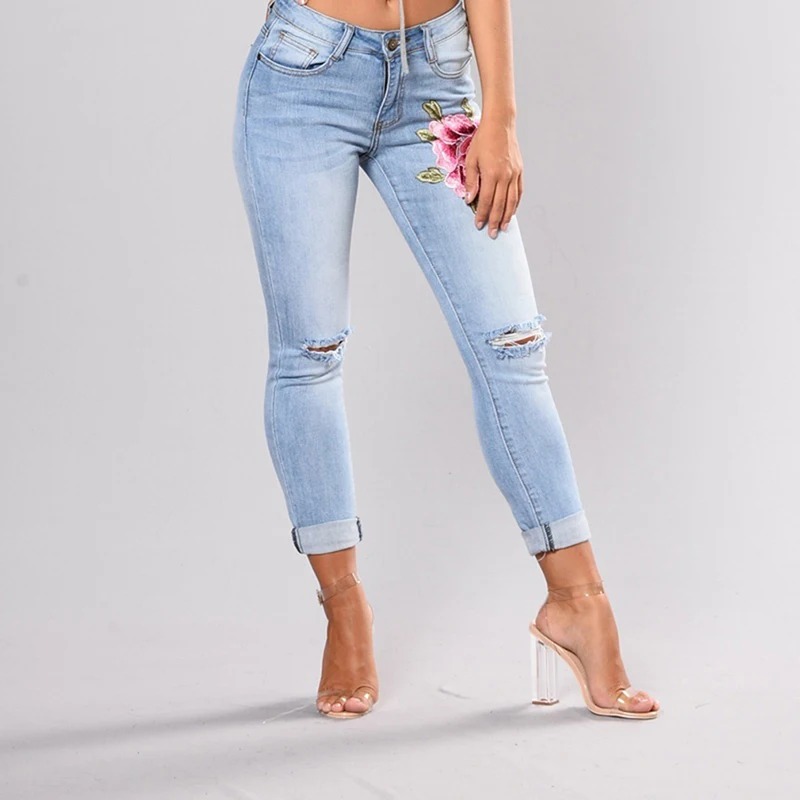 Женские Стрейчевые джинсы, эластичные джинсы с цветочным принтом, женские джинсовые брюки-карандаш, рваные брюки с дырками, джинсы с вышивкой розы