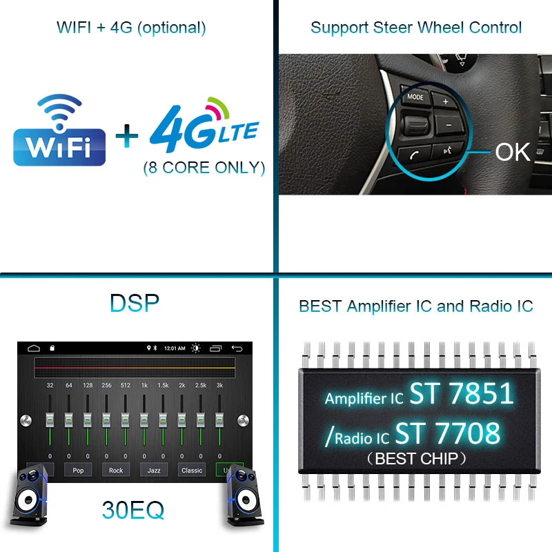 С 30 звуковыми эффектами DSP, качество звука транспортного средства, цвет тона, реверберация изысканно и свободно.DSP-цифровая система усиления. Это делает качество голоса al лучше, чем раньше, и делает радиосигнал лучше, чем раньше. Только автомобили меньшей версии имеют заводскую систему D5P на рынке. Если вы покупаете этот чип. В будущем на вашем автомобиле также будет установлена система DSP.