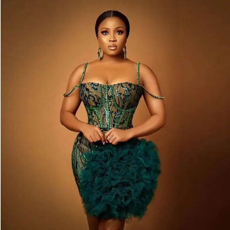 Aso Ebi африканские темно-зеленые короткие платья для выпускного вечера, сексуальные фатиновые Вечерние платья на бретелях-спагетти с оборками, на молнии сзади