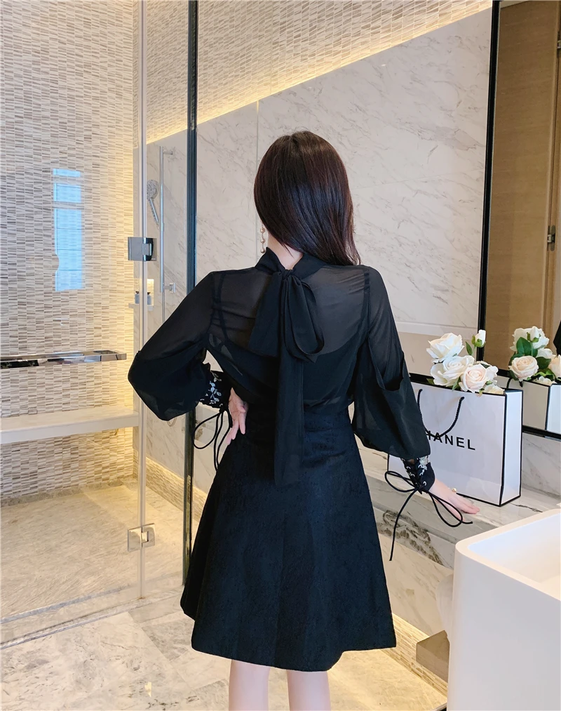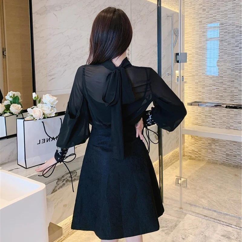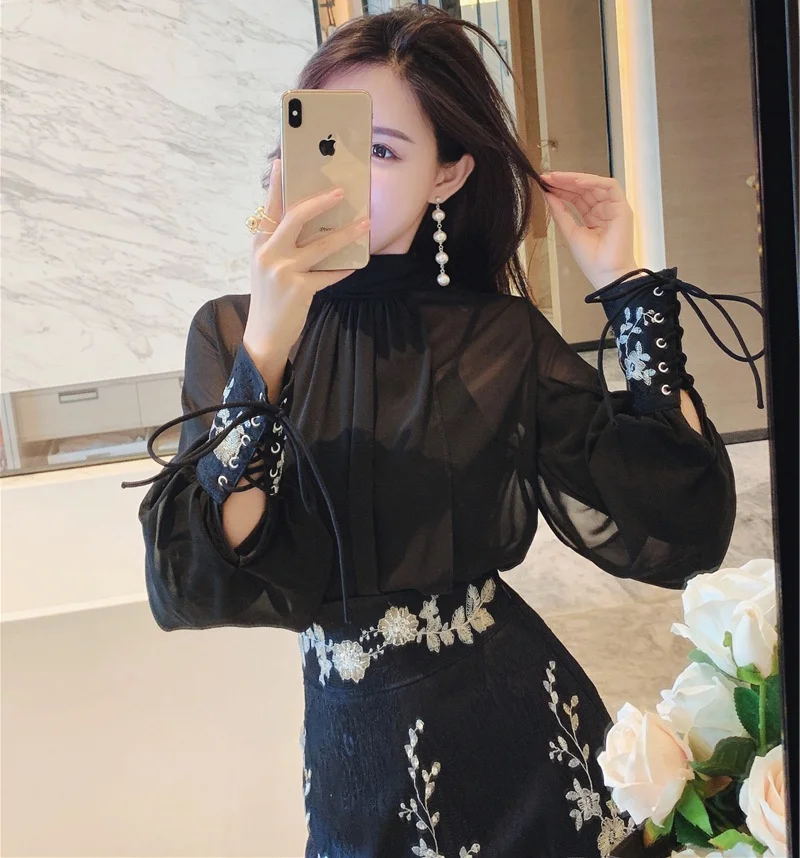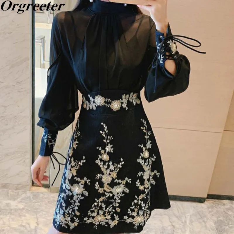 Женский шифоновый костюм из рубашки и юбки, роскошный костюм из двух предметов с вышивкой из бисера, весна-осень