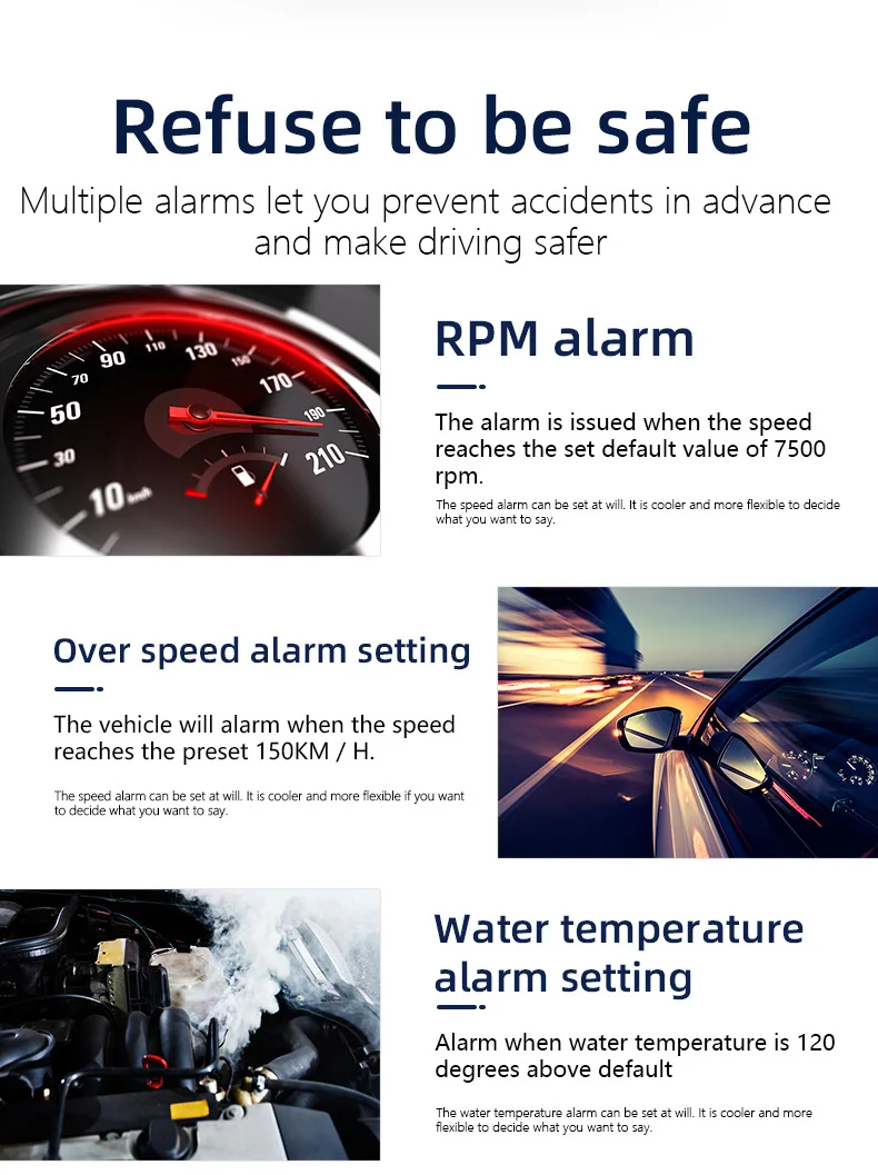 Будильник: сигнализация с температурой воды, сигнализация напряжения, напоминание о смене передач, сигнализация с превышением скорости, напоминание о усталости вождения, сигнализация с отказом двигателя