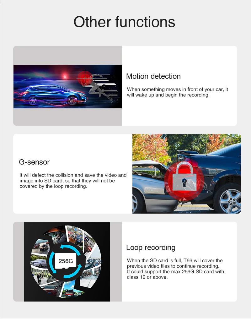 Он поддерживает запись 4 камеры в то же время, таким образом, вы можете проверить ситуацию вокруг вашего любимого транспортного средства все время.