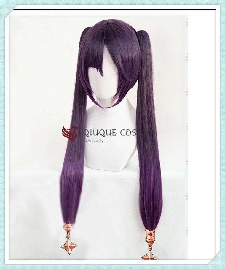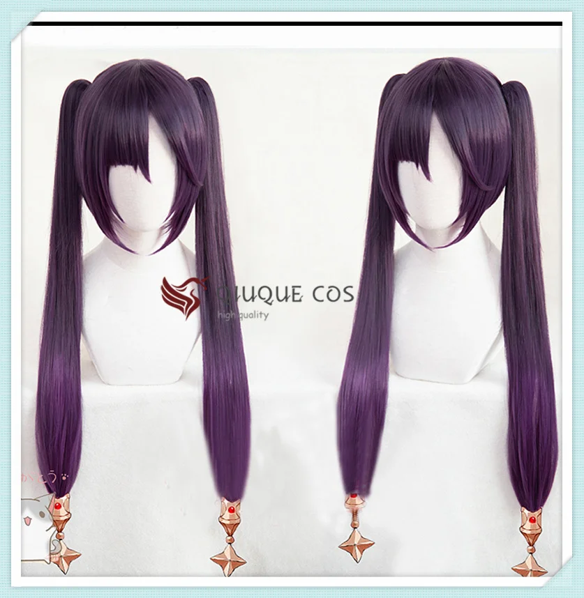 Genshin Impact косплей парик Мона длинные прямые двойные конские хвосты челка темно-фиолетовые термостойкие волосы для взрослых Хэллоуин парик + парик шапочка