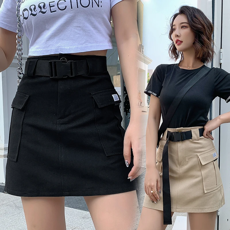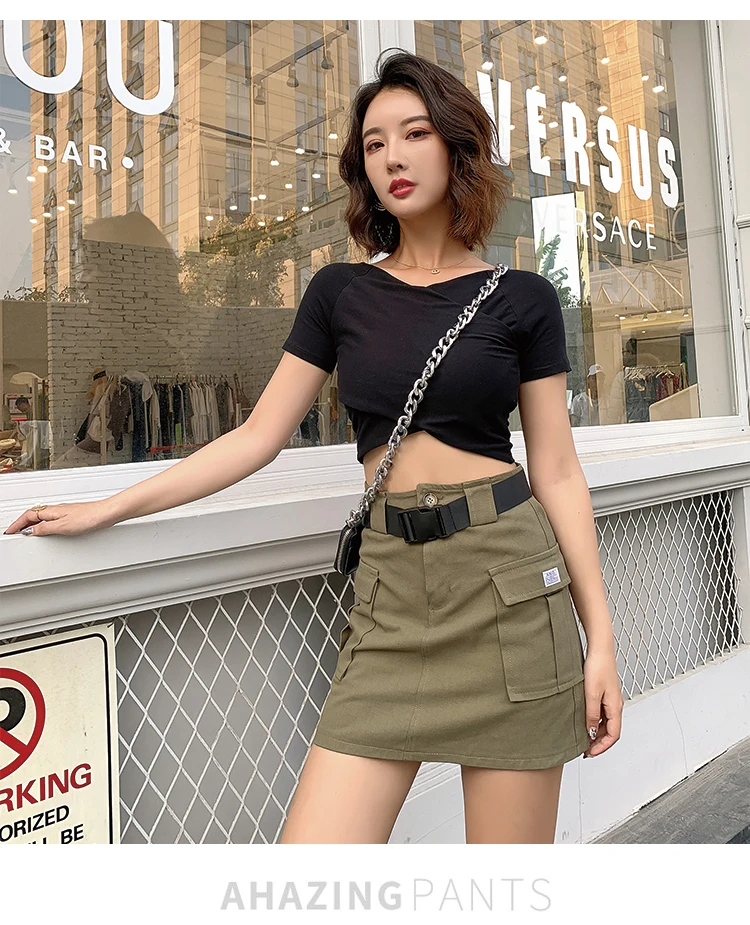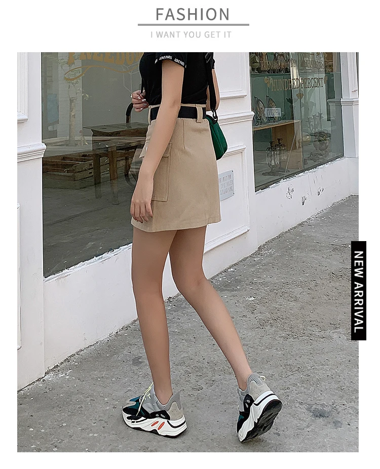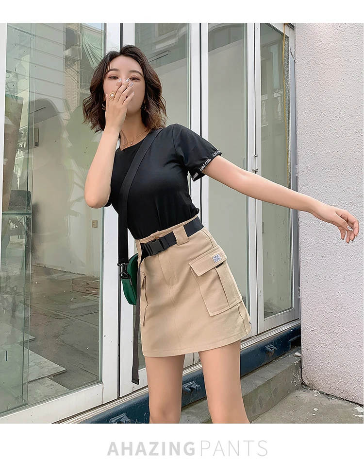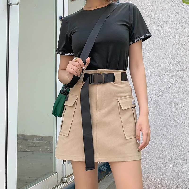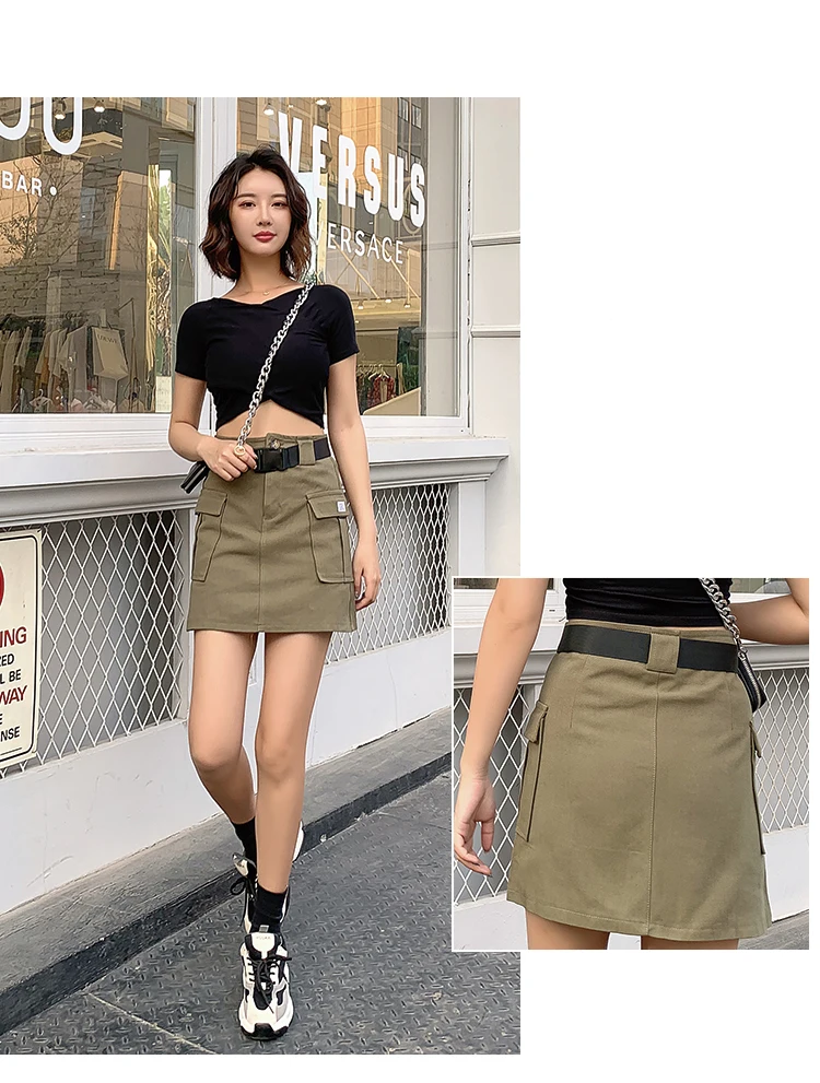 Корейская мода, высокая талия, карманы, Короткие трапециевидные юбки y2k для девочек-подростков, Летняя Повседневная мини-юбка цвета хаки, черный, с поясом, C281
