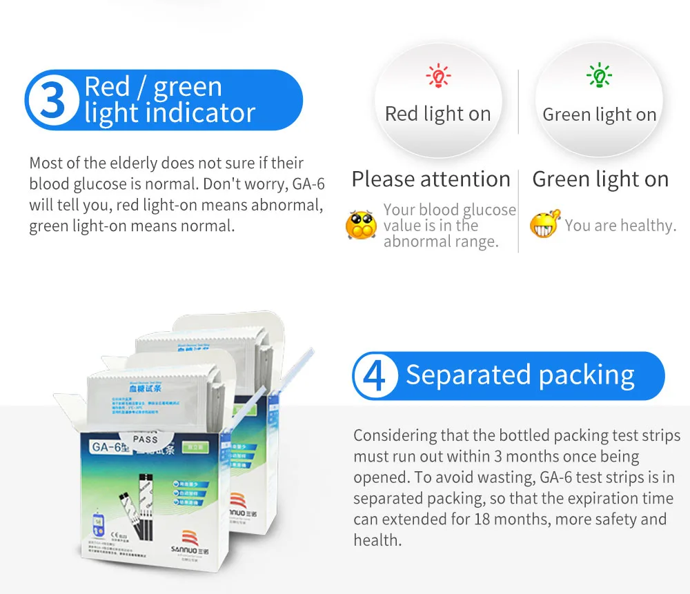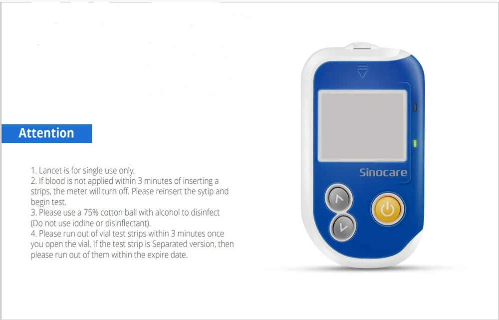 1. Нормальный диапазон для диабета 2 типа (только для справки):Пост глюкоза в крови (FBG): 3,9-7,2 ммоль/л (70-110 мг/дл).Постпрандял сахар в крови (2 часа после приема пищи): 4,4-8,0 ммоль/л (70-140 мг/дл).2. Является ли Тестовое значение точным?Иногда отклонение значения сахара в крови происходит из-за неправильного использования, пищевых эффектов и изменений настроения. Предположение заключается в том, что для непрерывного и регулярного тестирования уровня глюкозы в крови на сервальный день, затем сделайте ссылку.3. Могу ли я повторно использовать ЛанцетНет. Ланцет-Это одноразовое медицинское устройство, пожалуйста, не используйте повторно, чтобы предотвратить инфекцию.Кроме того, количество тестовых полосок и лент соответствует, поэтому нет необходимости повторного использования. 4. Может ли низкая батарея повлиять на тестовые значения?Нет. В чехол низкого заряда батареи, счетчик будет отображать значок батареи и E-1, в то время, вы должны обменять батареи.