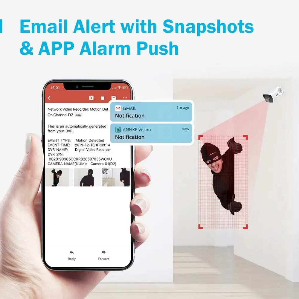 Камера может передавать Потрясающие hd-видео на ваш смартфон и планшет через бесплатное приложение для просмотра, отправлять вам push-уведомления в реальном времени и оповещения по электронной почте, как только камера обнаруживает подозрительные движения человека.