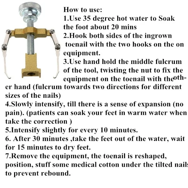 Способ использования: 1. Используйте горячую воду 35 градусов, чтобы замочить стопу около 20 минут 2. Закрутите обе стороны вросшего ногтя двумя крючками на оборудовании.