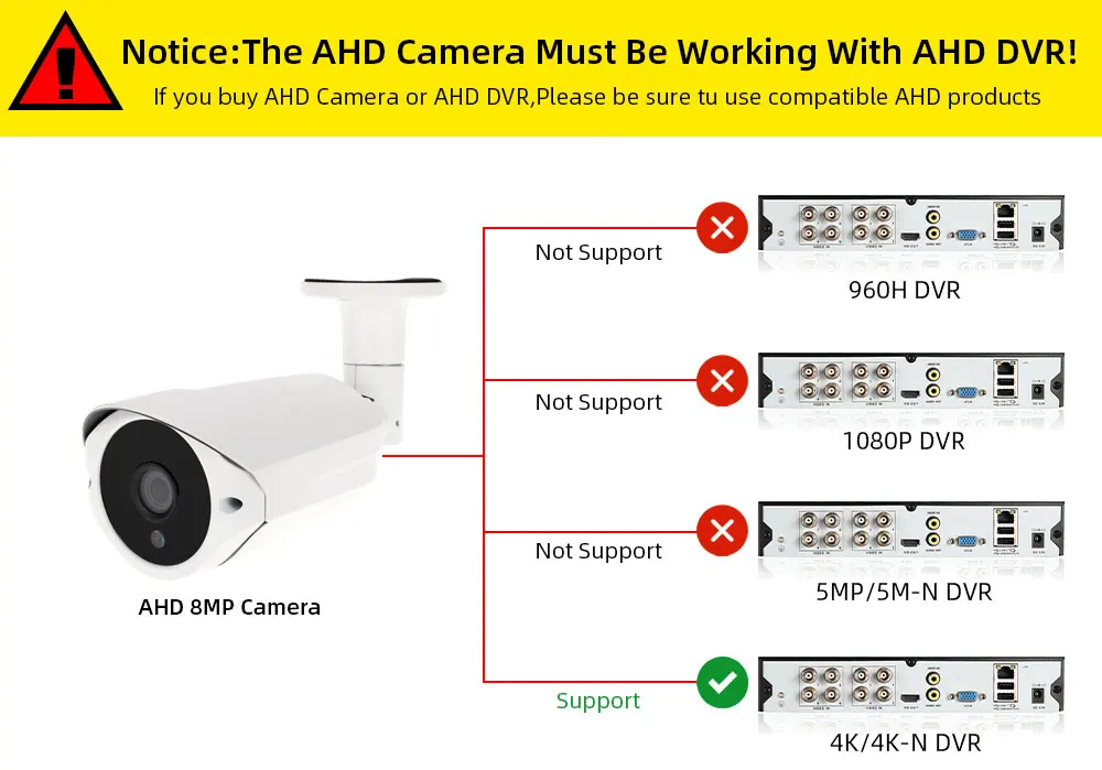 Это супер HD 8MP камера, работа должна быть использована 4K AHD DVR или 4K-N AHD DVR!, Если нет, камера AHD 8 Мп не работает.Нельзя использовать "AHD 5MP System" "AHD 5M-N System" и "AHD-H 1080P System","AHD 1080N System" и "AHD AHD-M 720P System" AHD DVR или "Common DVR", камера 8MP AHD не работает!