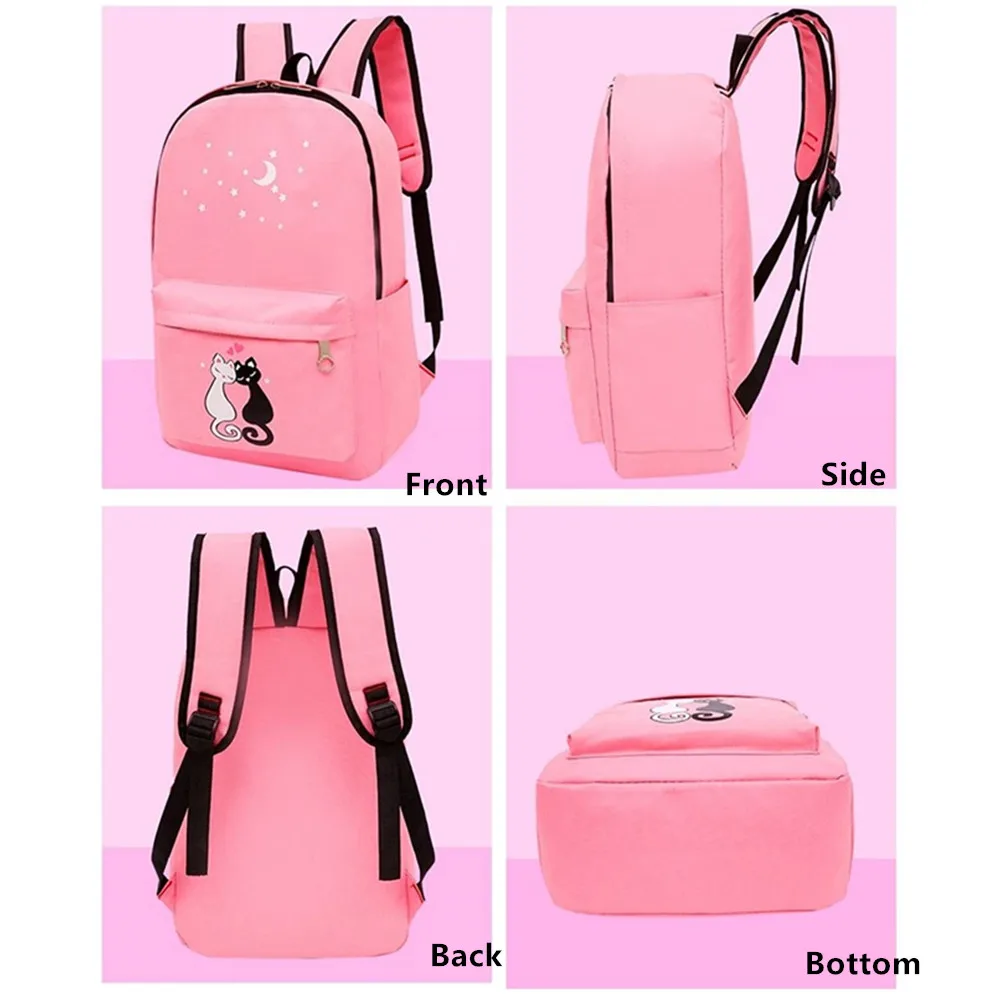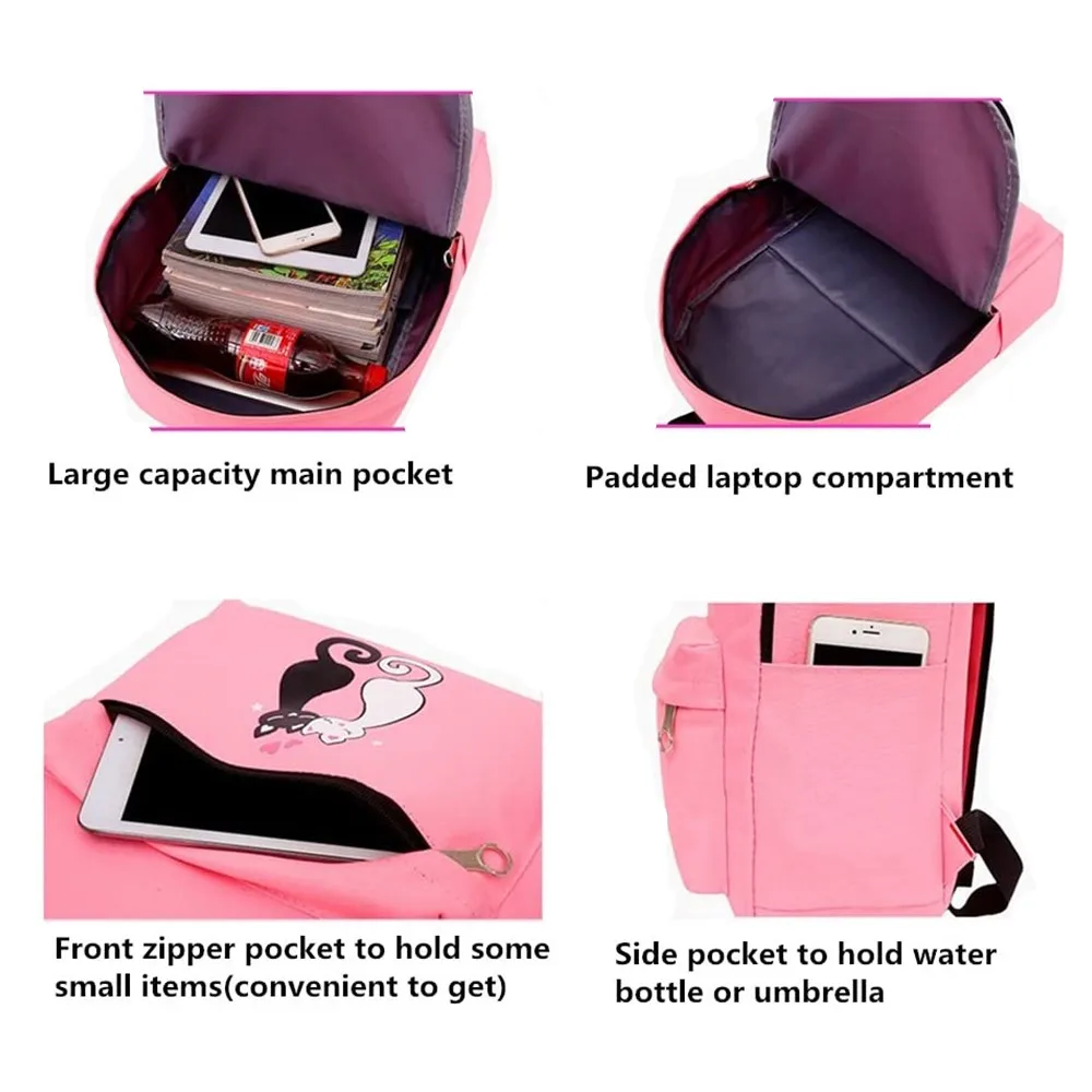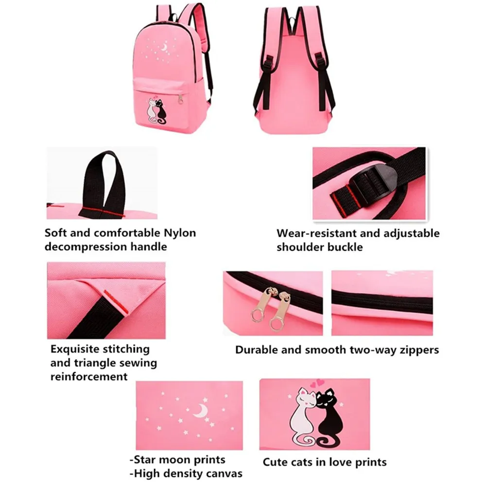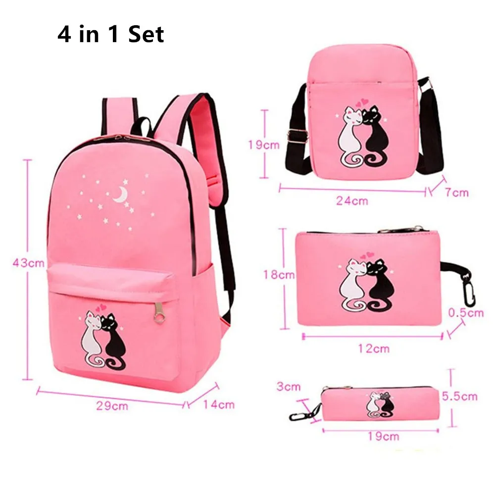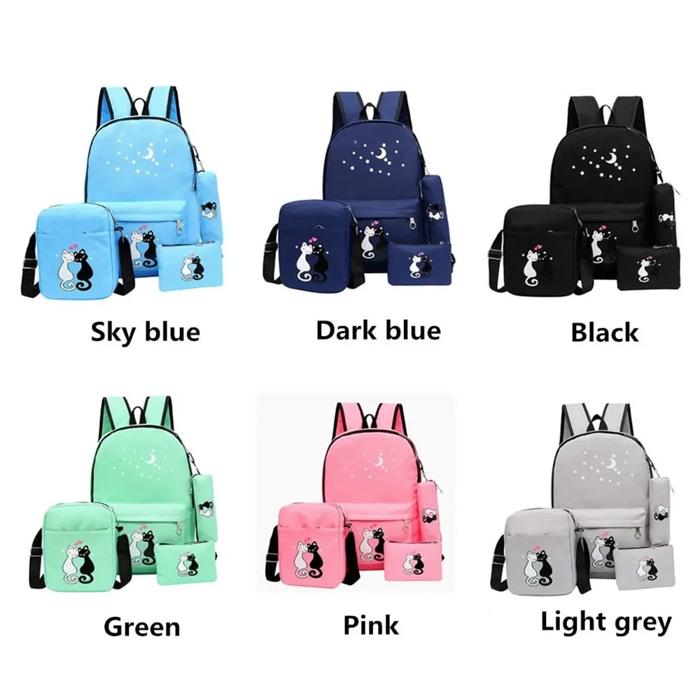 4 шт.компл. женский рюкзак с принтом кошки, холщовые школьные ранцы...