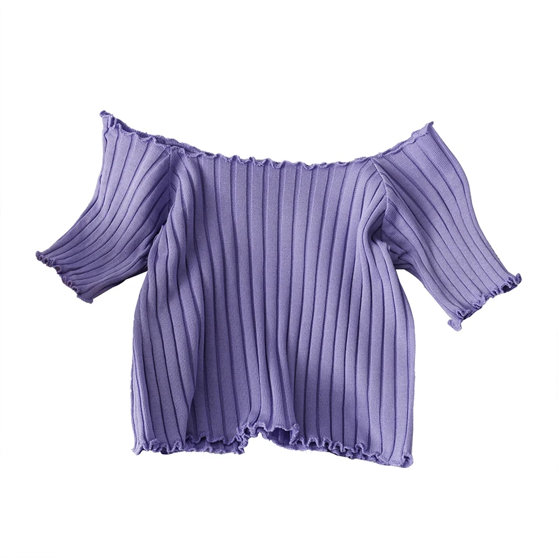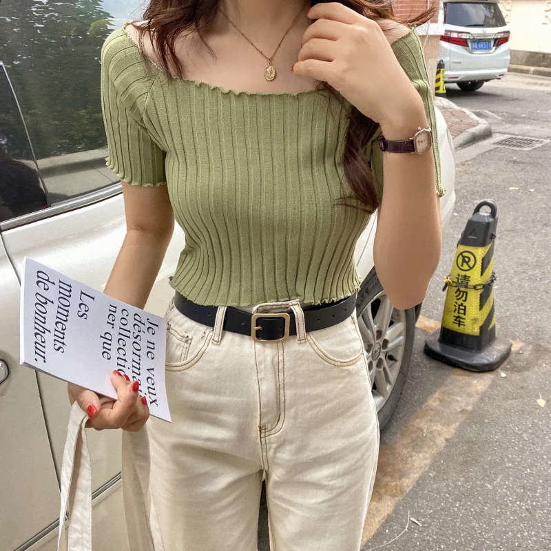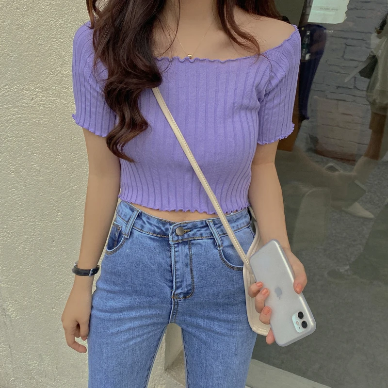Кроп-топ женский трикотажный однотонный с коротким рукавом и оборками на подоле