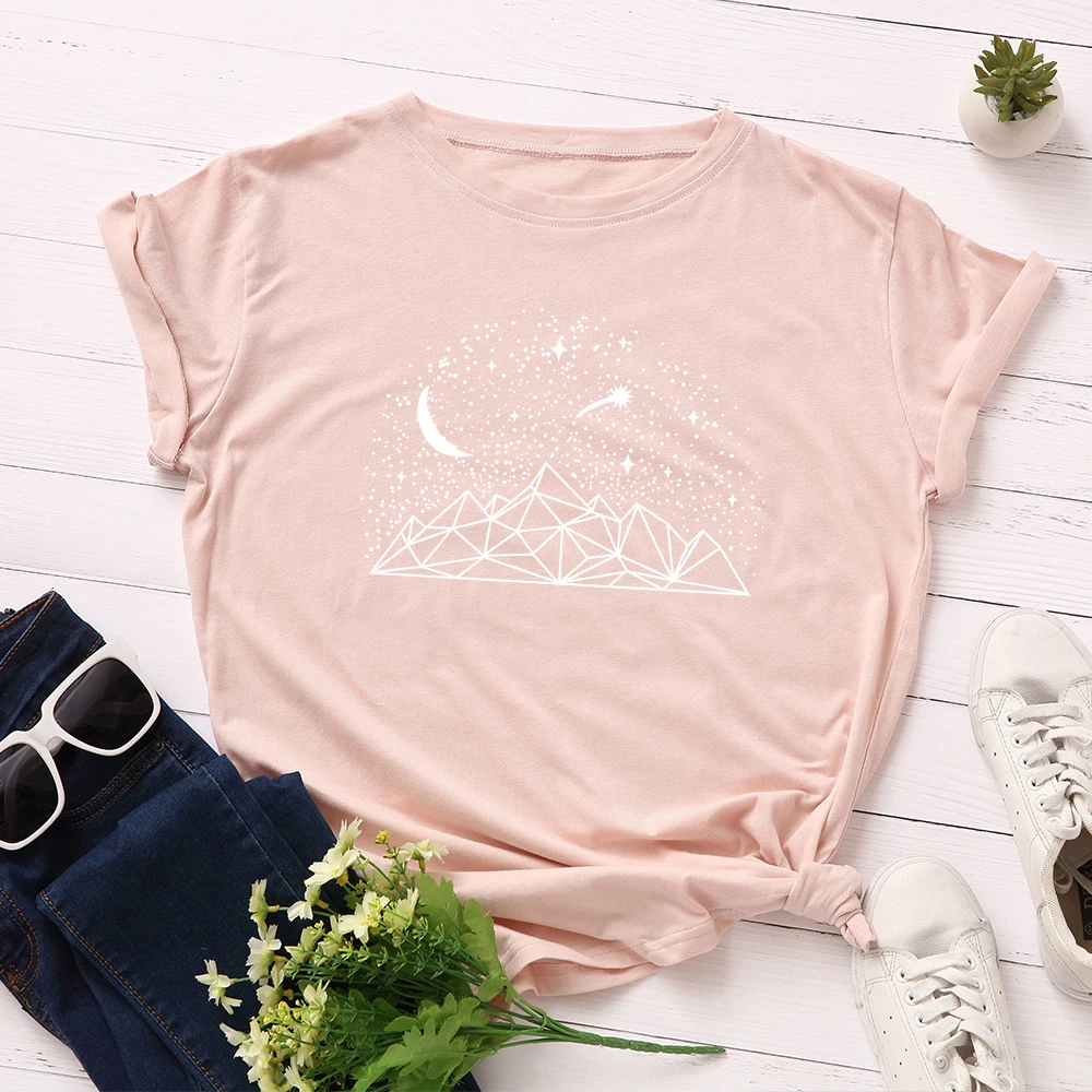Футболка женская с графическим принтом, хлопковая рубашка с коротким рукавом, топ, повседневная одежда с принтом в подарок, Луна, звезда, горная ночь