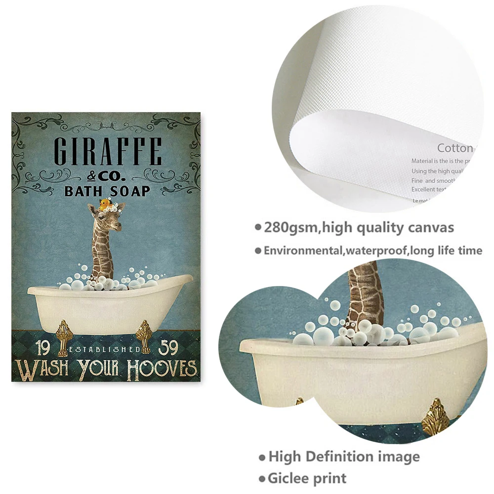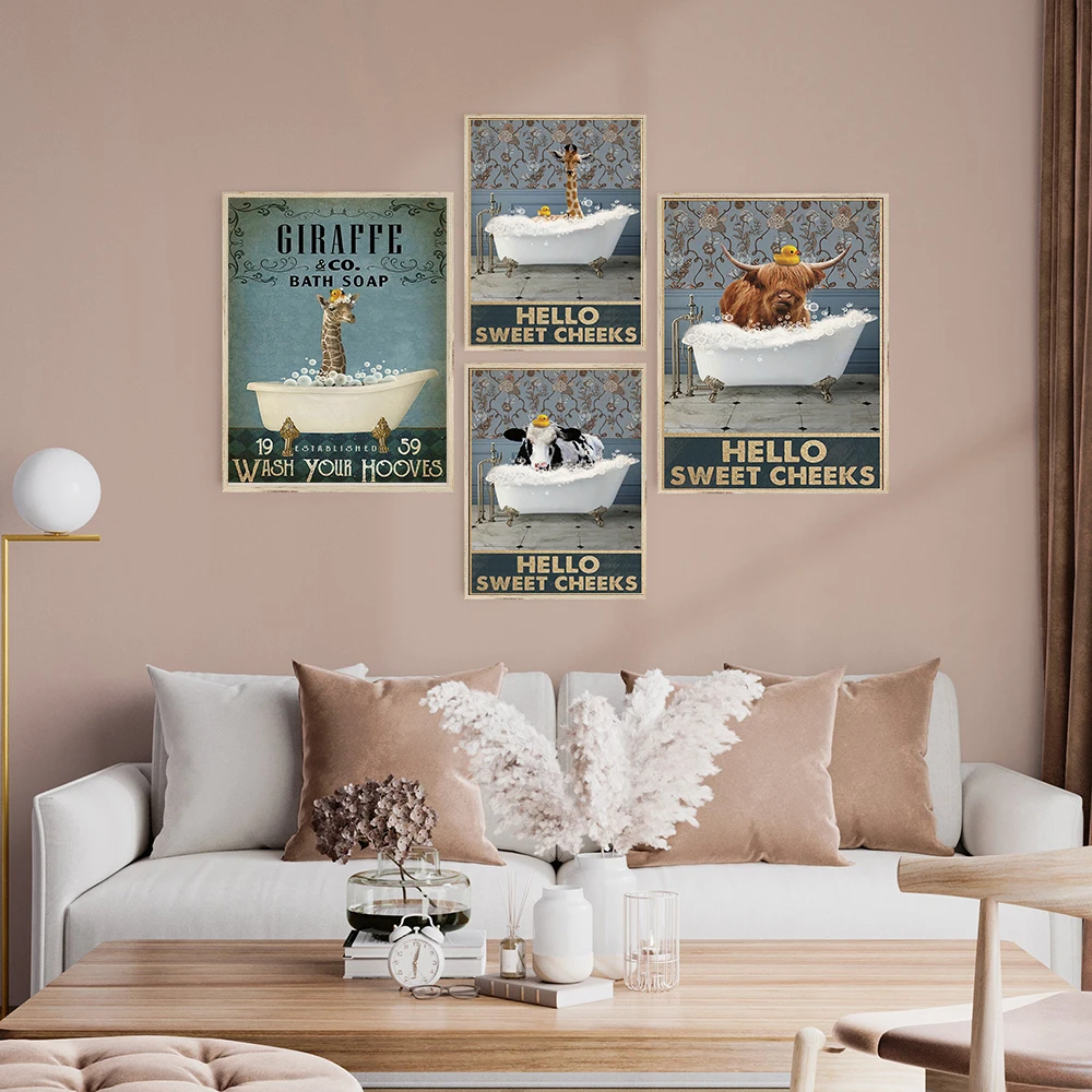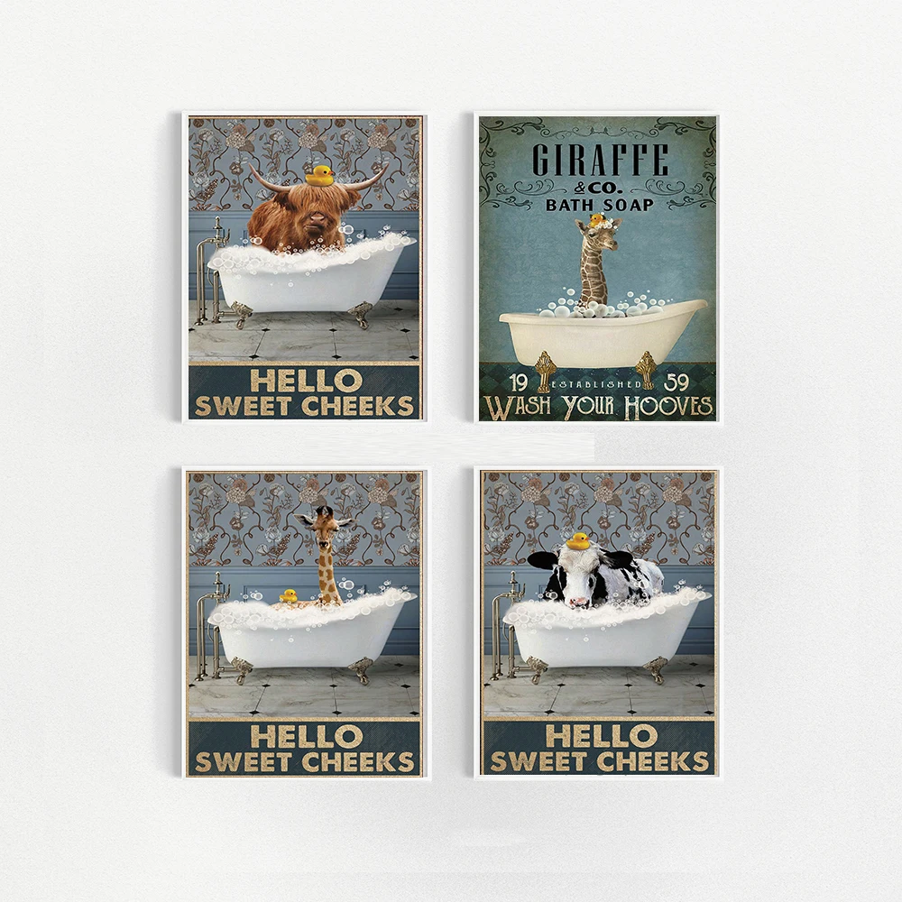 Забавный постер Highland для ванны с крупным рогатого скота, жираф, Художественная печать, винтажные милые щеки, забавная Картина на холсте для ванной комнаты, домашний декор