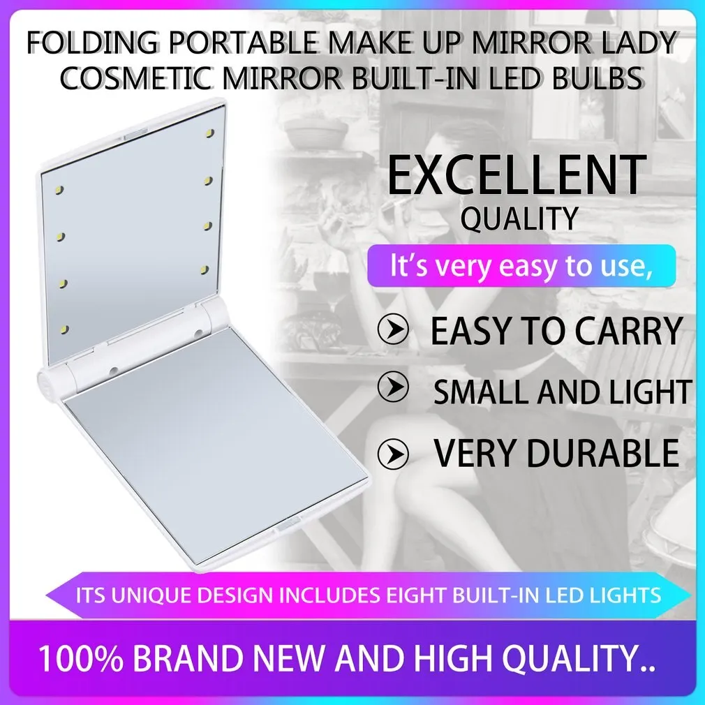 Особенности:Используйте это складное карманное зеркало в качестве идеального аксессуара для макияжа.Рисование линий вокруг глаз, нанесение BB крема, другие действия для макияжа, бритье, замена контактных линз и т. д., этот mirro всегда готов предложить вам чистую и блестящую среду, когда и где угодно.Его уникальный дизайн включает в себя: 8 встроенных светодиодных ламп, что дает вам возможность сделать макияж при низком освещении, если это необходимо.