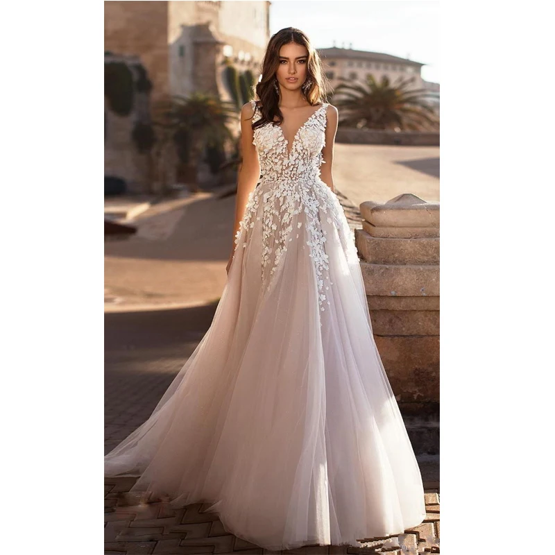 2021 Изящные пляжные свадебные платья с v-образным вырезом и открытой спиной, 3D Цветочная аппликация, кружева тюль для платья невесты, Vestido De Novia