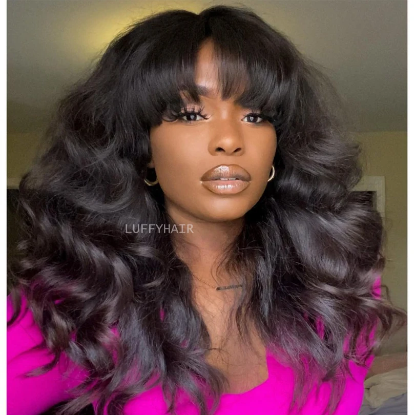 Парики из человеческих волос с челкой Luffywig, 180% плотности