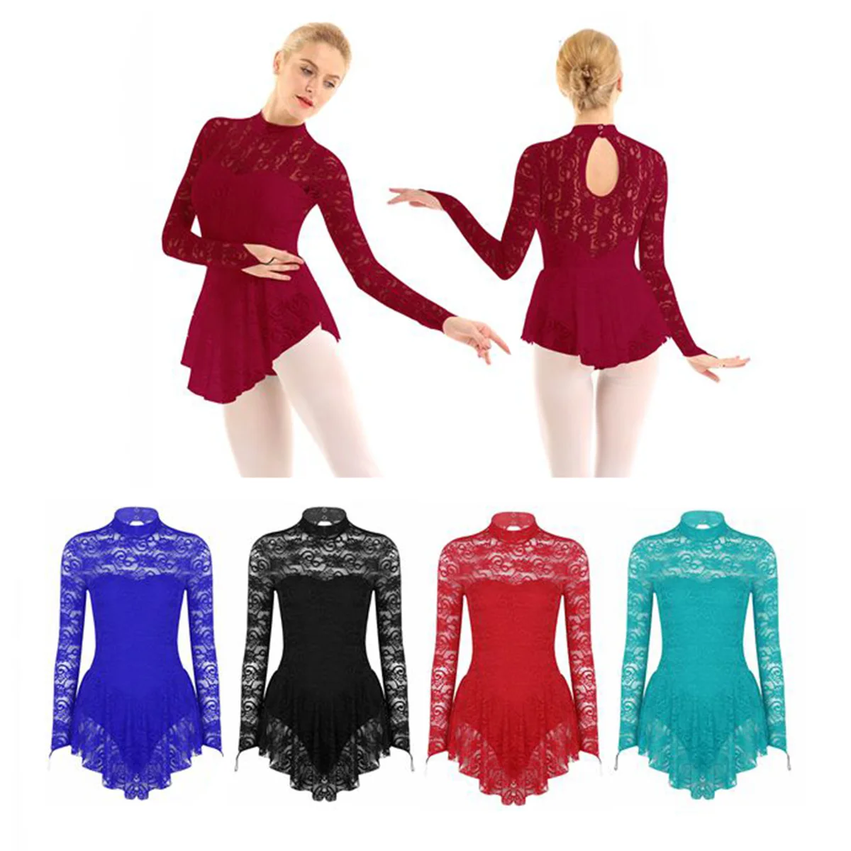 Женская кружевная танцевальная одежда с длинным рукавом для взрослых, платье для фигурного катания на коньках, балерины, балетки, гимнастики, трико, платья