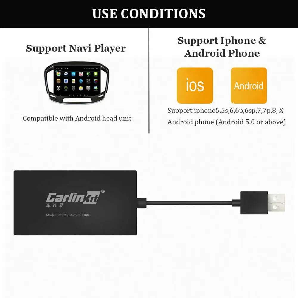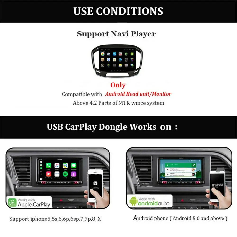 Голосовое управление: -Поддержка Siri/музыка/карты/телефонные звонки/сообщения/аудио книги. -Функция Siri поможет вам позвонить Розе или любому из ваших друзей. -Пожалуйста, обратите внимание, что скорость работы нашего устройства зависит от скорости вашего телефона на ios. Сенсорный экран и hd-дисплей: -Направленное управление и просмотр телефона на автомобильном навигационном экране с помощью usb-кабеля. Свободные руки и безопасное вождение: -Совершать/отвечать на звонки, проверять голосовые сообщения, текстовые сообщения и создавать карты. -Слушайте ваши любимые песни с помощью приложений в формате «hands free», «Apple Music» или «Apple Music». Как установить APK? APK: http:/121.40.123.198:8080/AutoKit/AutoKit.apk 1. Установите Apk для продукта в головном устройстве Android. 2. Подключите продукт к usb-порту головного устройства Android. 3. Затем подключите оригинальный usb-кабель сотового телефона к usb-порту продукта. 4. Автомобильное радио войдет в интерфейс CarPlay. Описание: Цвет: белый Материал: пластик Размеры: 7,7 см x 3 см x 1,2 см/3 ''x 1,2'' x 0,5'' Вход: USB 5V 1A Выход: 5 В 0.5A Навигационный плеер: система Andriod 4,2 или выше Мобильный телефон: iPhone iOS7.1 и выше; Android phone 5,1 и выше. Посылка включает в себя: 1 х проводной USB ключ CarPlay1 X Руководство пользователя