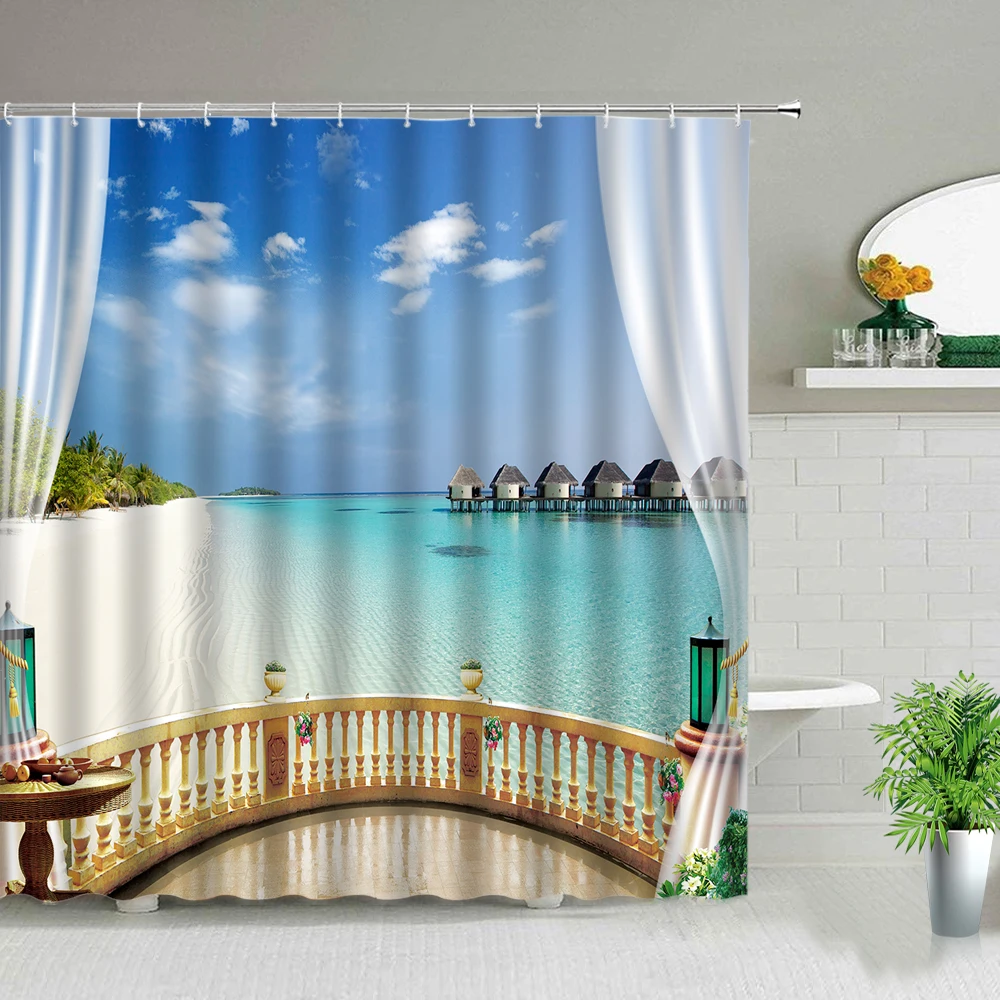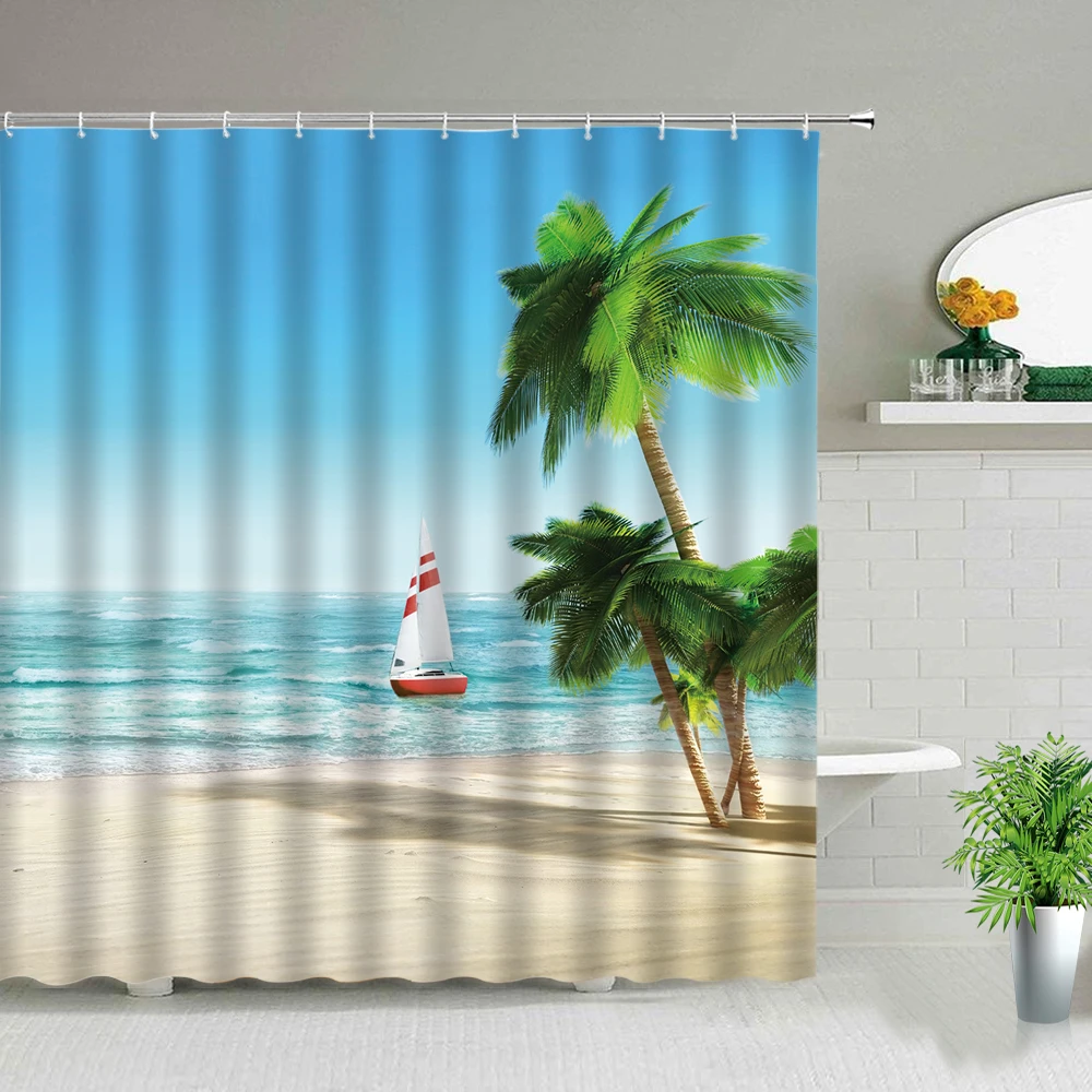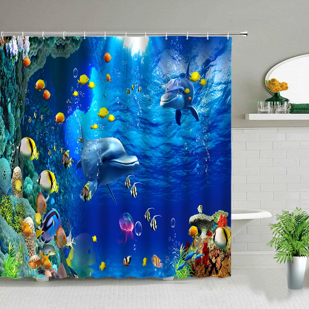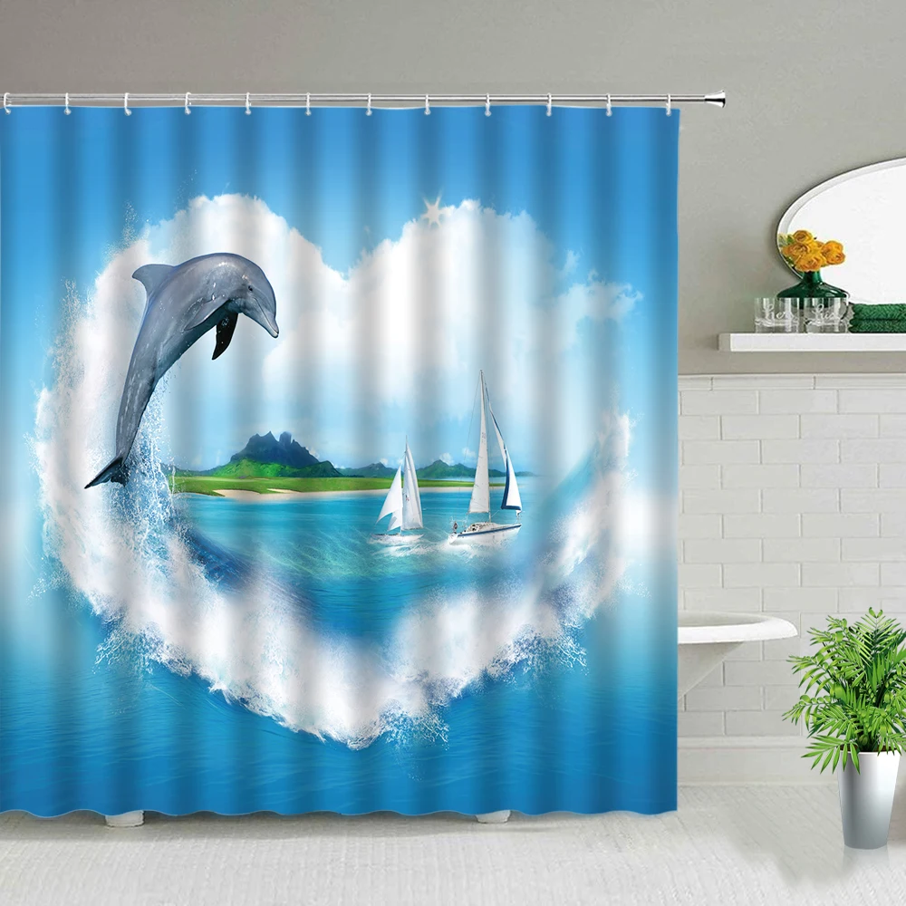 Занавеска для душа с изображением дельфина в океане, пляжа, пальмы, тропической рыбы, пейзаж для ванной комнаты, водонепроницаемая тканевая занавеска для ванной с крючком