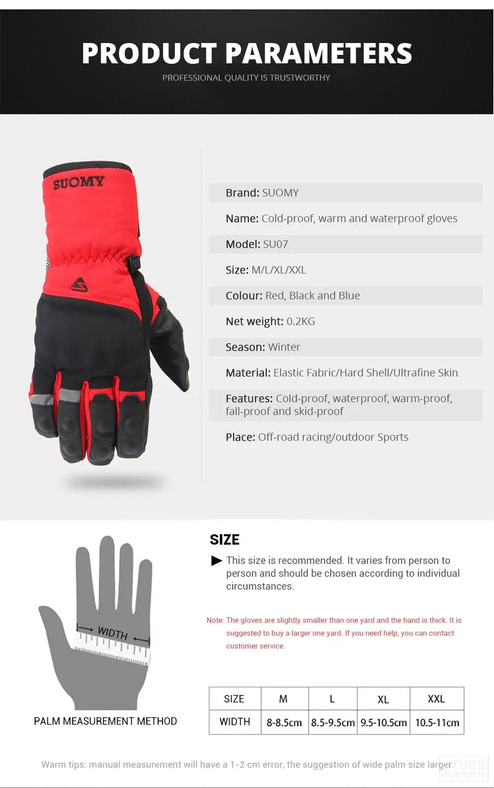 Specification:Name: Cold-resistant and warm waterproof glovesMaterial: Stretch fabric, hard case, microfiber leatherFeatures: Cold-resistant, waterproof, warm, anti-fall, anti-skidApplicable place: Off-road racing, outdoor sportsColor: Red, Black, BlueSize: M, L, XL, XXL
