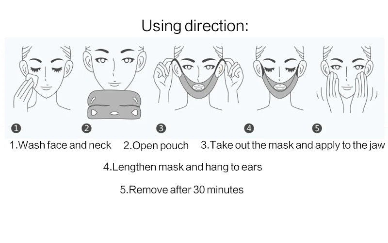 Способ использования: чистка лица. Нанесите тонкий слой маски на челюсть. Удлините маску и Повесьте на уши. Около 15-20 минут снимите маску. Используйте ладонь для массажа лица снизу вверх для лучшего поглощения.