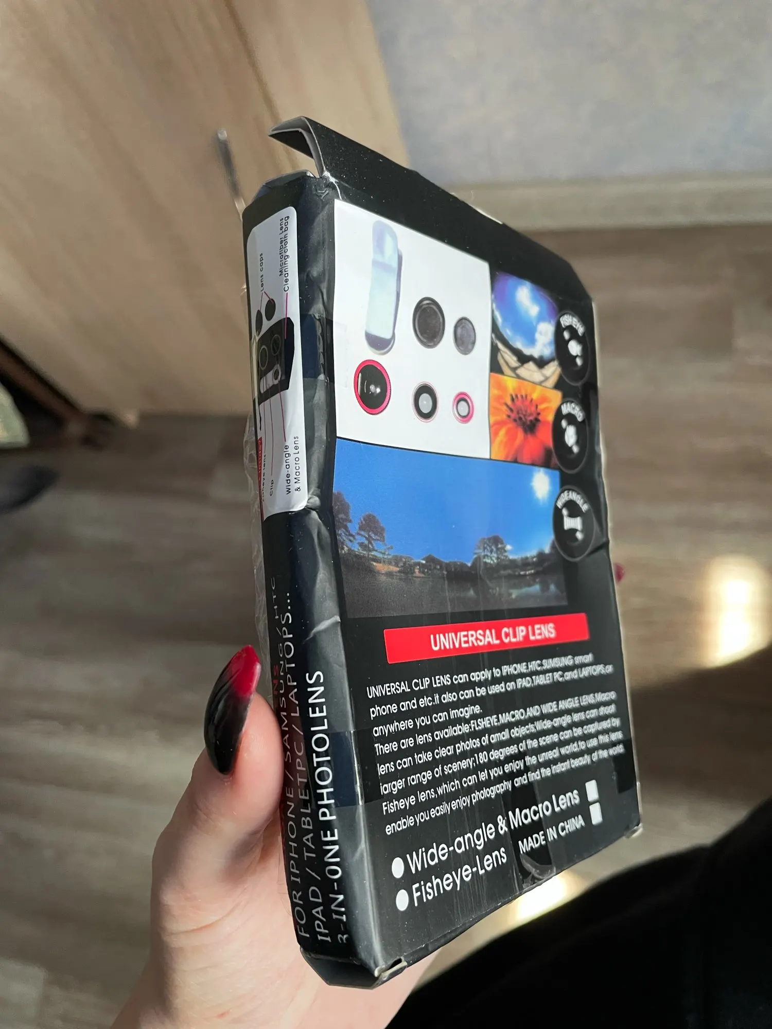 Очень хороший продукт для любителей фотографий. Он живет с небольшой сумкой для хранения целей, чтобы не повредить их, есть также небольшая ткань для удаления остатков пыли или отпечатков пальцев. Он зажимается на всех смартфонах (Iphone и Android). Качество изображения правильное. Очень прост в использовании. Иметь воображение, чтобы создать идеальное фото.