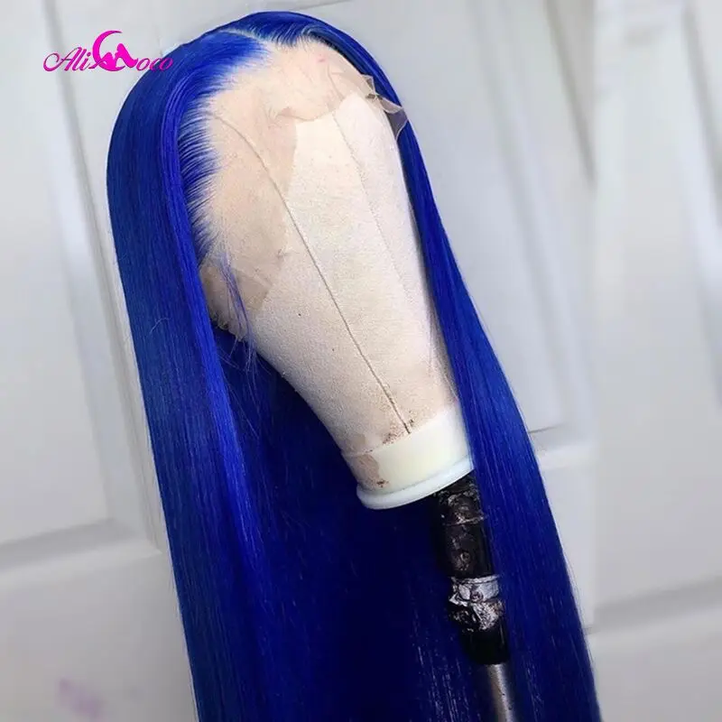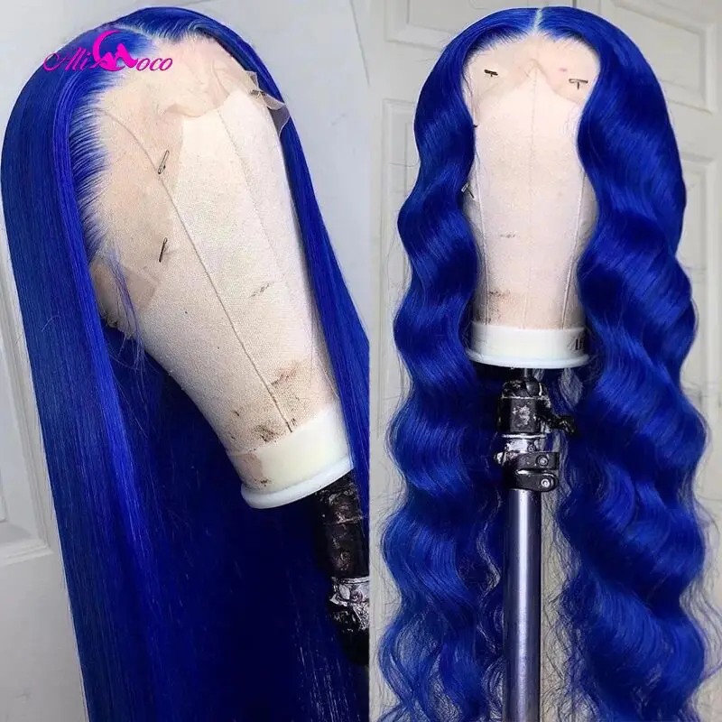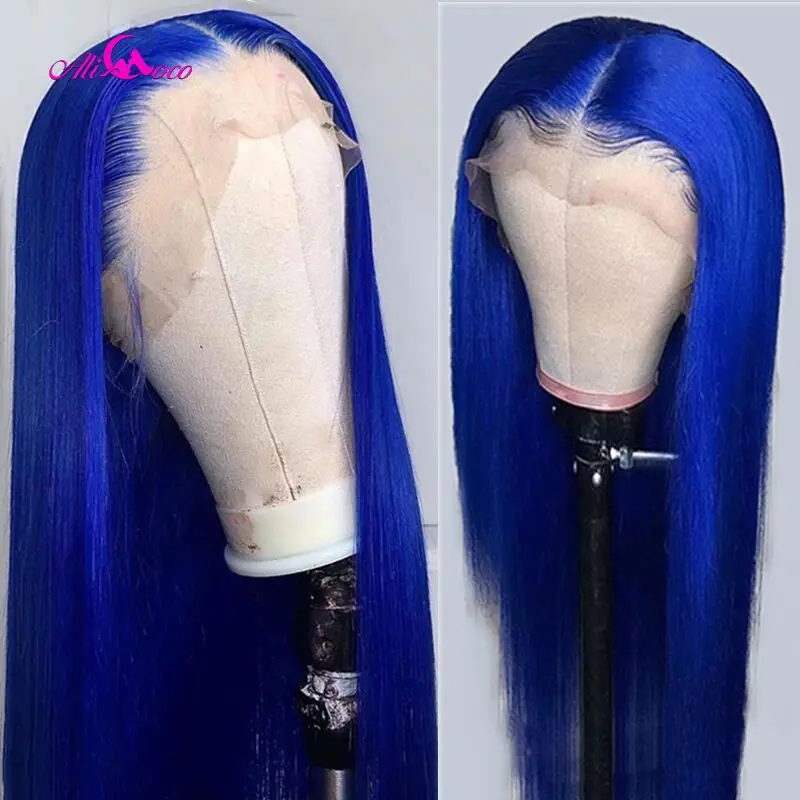 Перуанские кости прямые человеческие волосы парики 13X4 парик фронта шнурка предварительно выщипанный бесклеевой синий цвет волнистый часть парик для чернокожих женщин