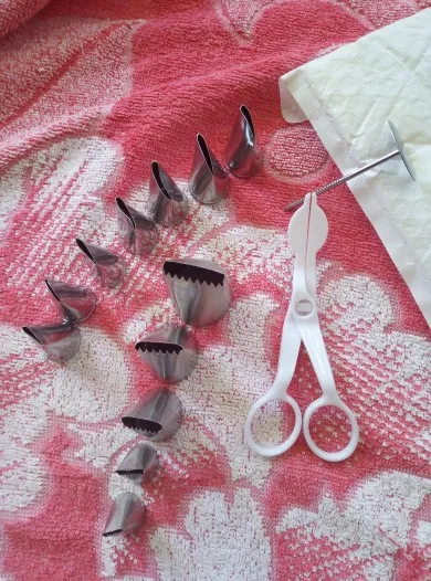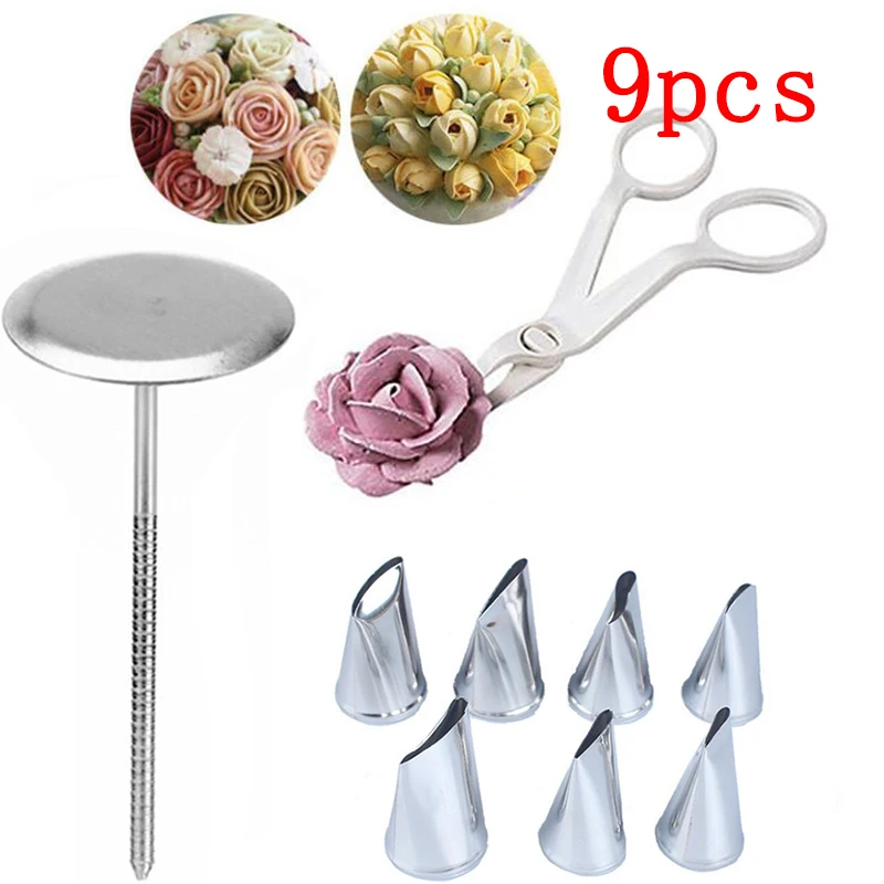 9 шт.набор, ножницы для цветов + поднос для торта + 7 шт. тюльпанов, патрубок "Роза" для украшения ногтей, подъемник для помадки, крем для выпечки для перевода крема, кондитерские изделия