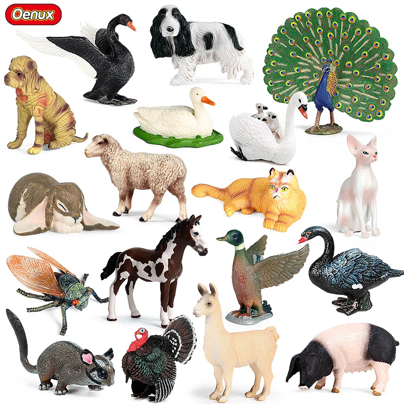 Характеристика:Oenux фермерские животные имитация птицы птица насекомое кошка собака гусиная утка свинья овца Павлин лошадь Фигурки ПВХ симпатичная детская игрушка