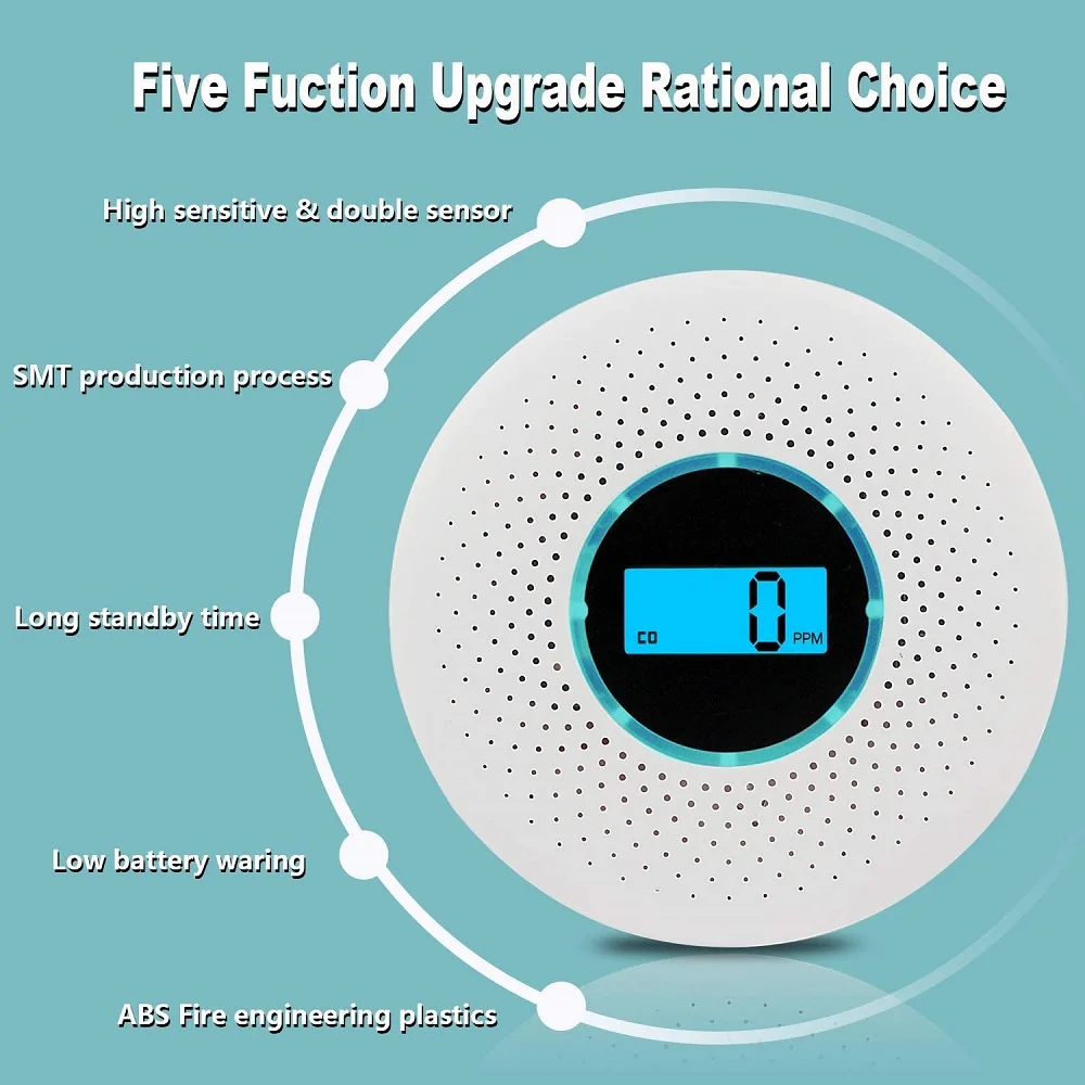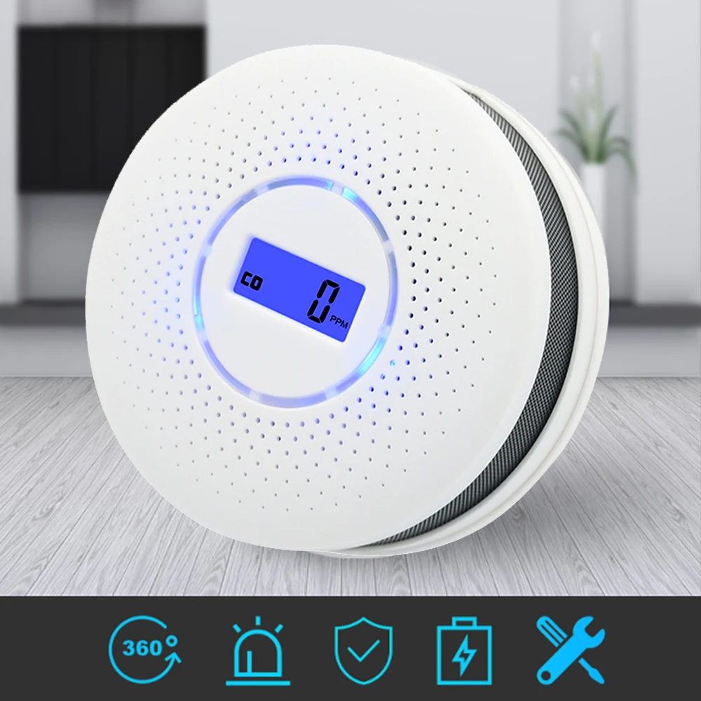 Датчик угарного газа и детектор дыма 2 в 1, ЖК-дисплей, питание от аккумулятора, пожарная сигнализация со светодиодной подсветкой и мигающим звуком