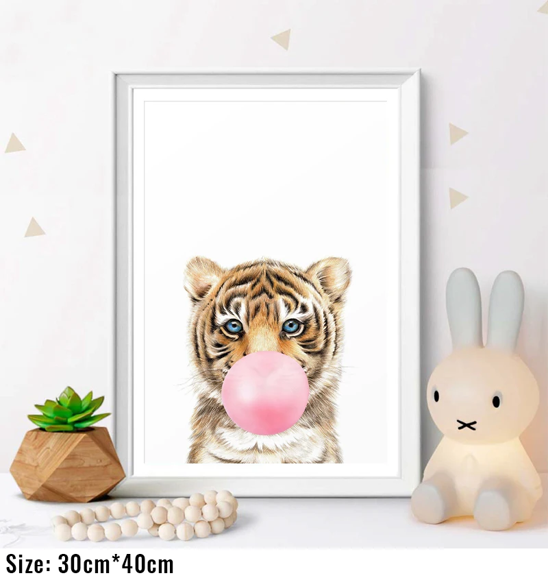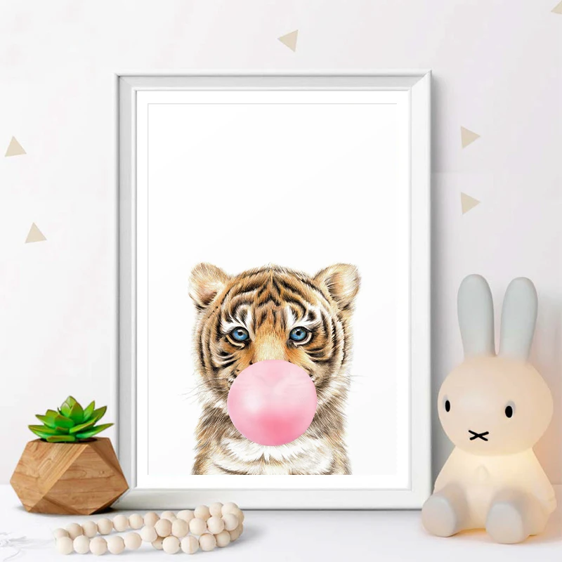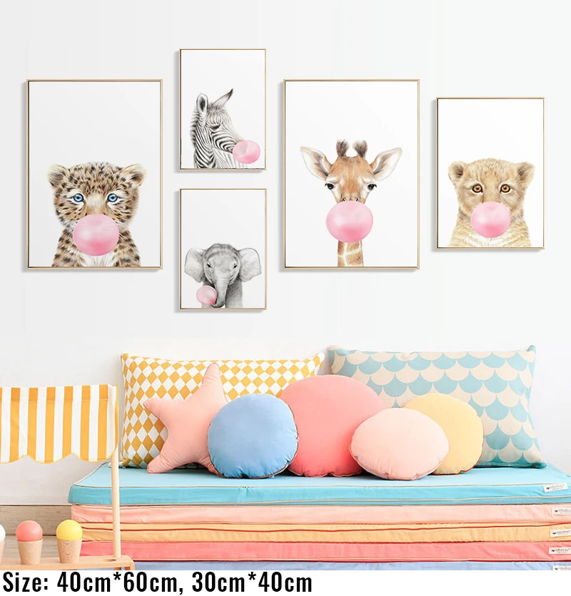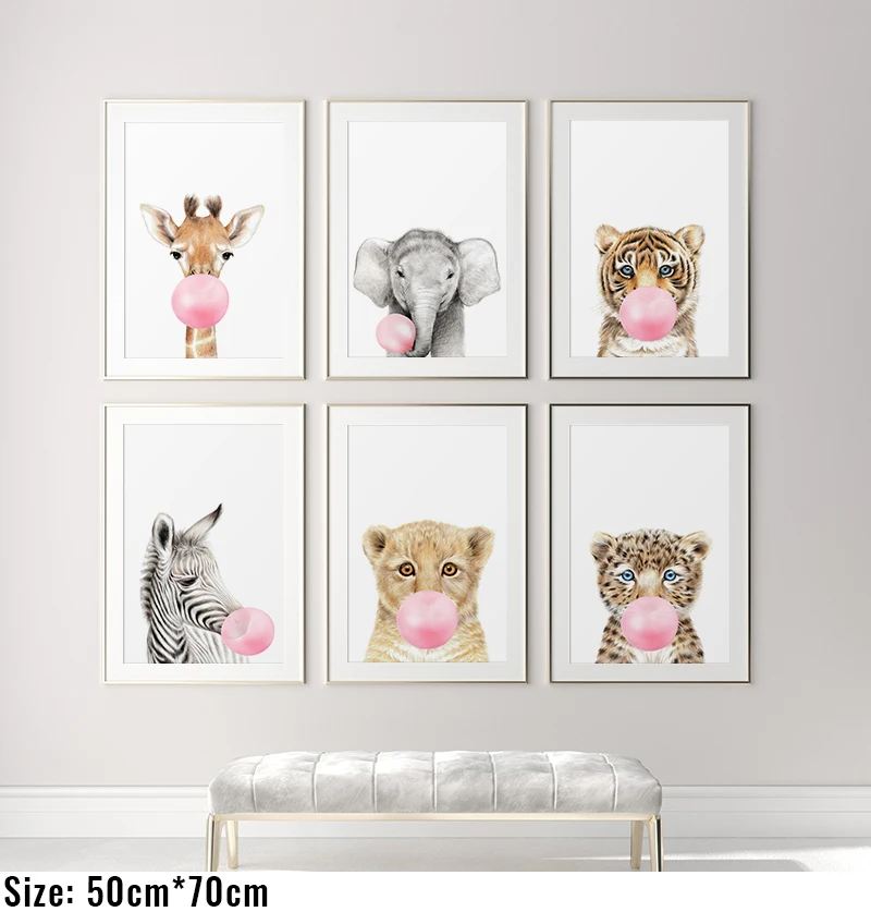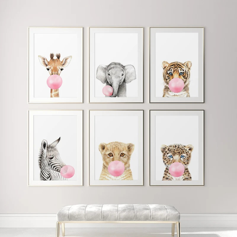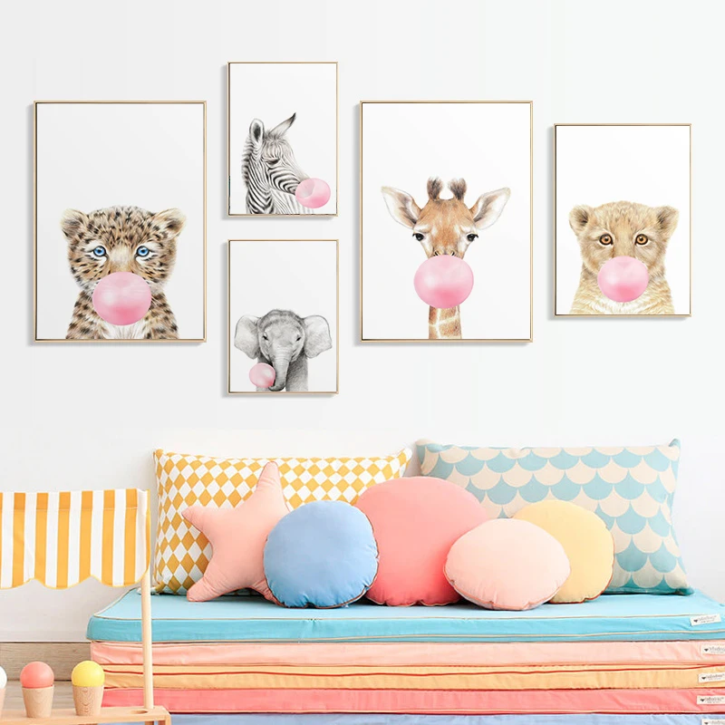 Картина для детской комнаты, настенный постер с изображением розового пузыря, жвачки, слона, жирафа, зебры, животное, скандинавский рисунок на холсте для детской комнаты