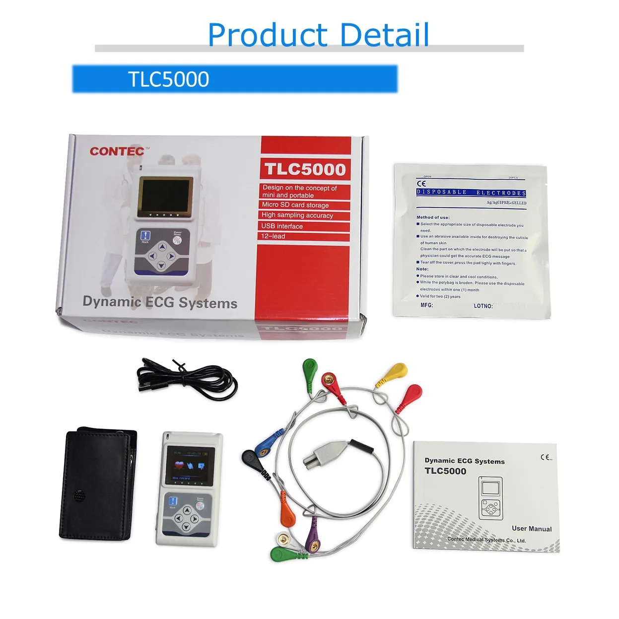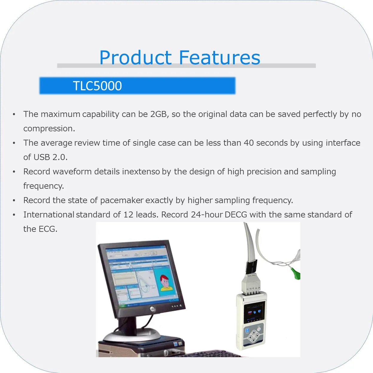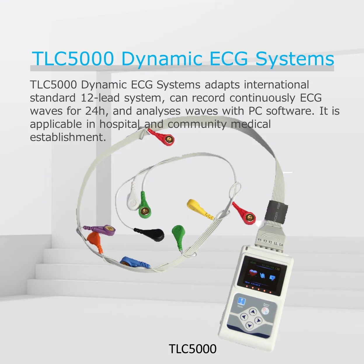 TLC5000 монитор ЭКГ, Системы s адаптируется международный стандарт 12-ведущая Системы, может записывать непрерывно ЭКГ волны в течение 24 ч и анализирует волны с программное обеспечения для подключения к компьютеру. Применяется в больницах и общественных медицинских центрах.