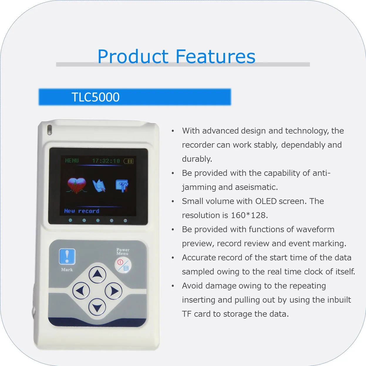 Особенности записи1. С передовым дизайном и технологией, регистратор может работать стабильно, надежно и долговечно.2. Предоставляется возможность анти-помех и aseismatic.3. Небольшой объем с oled-экраном. Разрешение 160*128.4. Предоставляются функции предварительного просмотра формы волны, обзора записи и маркировки событий.5. Точная запись времени начала выборки данных из-за реального времени само по себе.6. Избегайте повреждений из-за повторной вставки и вытягивания с помощью встроенной TF карты для хранения данных.7. Максимальная возможность может быть 2 Гб, поэтому оригинальные данные могут быть сохранены полностью без сжатия.8. Средние обзора время один чехол может быть меньше, чем 40 секунд с помощью интерфейса USB 2,0.9. Детали формы сигнала записи inextenso по дизайну высокой точности и частоты выборки.10. Запись состояния кардиостимулятора точно на более высокую частоту выборки.11. Международный стандарт 12 проводов. Запись 24 часа DECG с одной и той же стандарт ЭКГ.