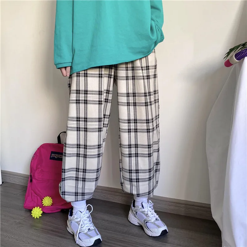 Клетчатые брюки в стиле Харадзюку, летние свободные женские спортивные брюки с эластичным поясом, корейские брюки для женщин, штаны оверсайз, хлопковые, полная длина