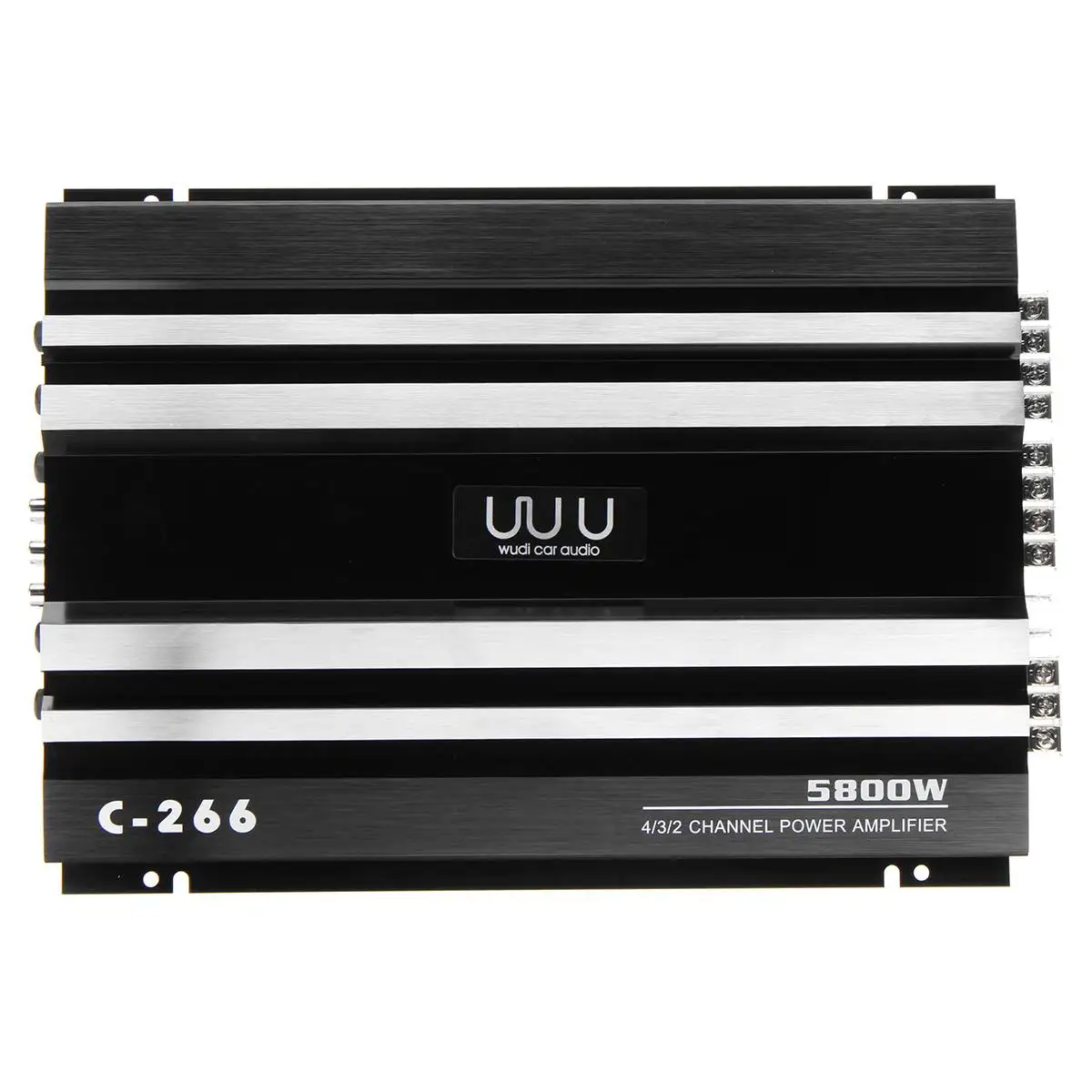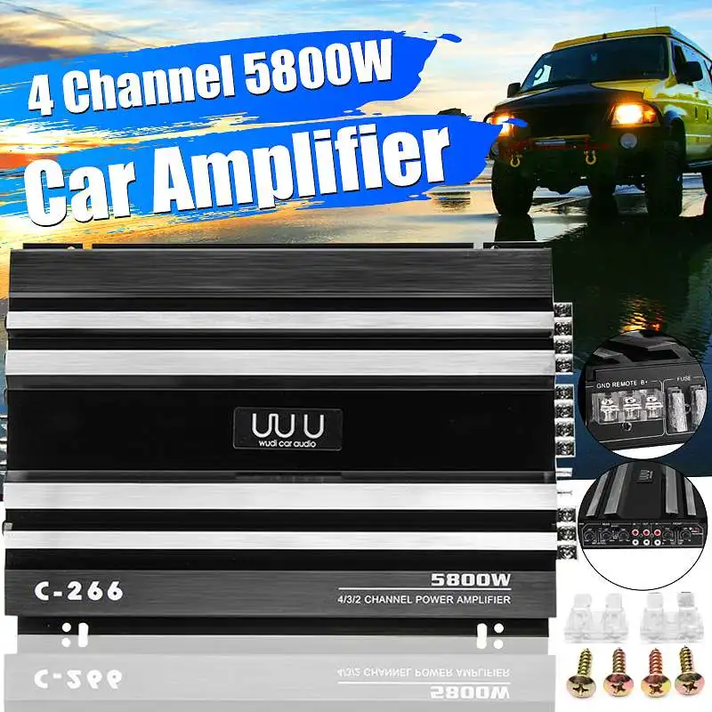 Посылка входит 1 X 4-канальный автомобильный усилитель1 X Руководство пользователя на английском языкеСовершенно новый и надежный качественный 4 канальный 5800 ватт автомобильный усилитель дарит вам прекрасное развлечение в автомобиле. Может подключаться к 4 динамикам, отвечает потребностям большинства пользователей. Технические характеристики 1. Модель: C2662. Максимальная мощность (2 Ом) 1450 Вт * 4 = 5800 Вт,Максимальная мощность (4 Ом) 725 Вт * 4 = 2900 Вт3. Мощность RMS (2 Ом) 700 Вт * 4 = 2800 Вт,Мощность RMS (4 Ом) = 300 Вт * 4 = 1200 Вт.4. THD: <0.02%5. Чувствительность: 90 дБ6. Частотная характеристика: 20 Гц ~ 20 кГц7. Рабочее напряжение: 12 В8. Размеры: 32x24x4,5 см9. Материал: алюминиевый сплав