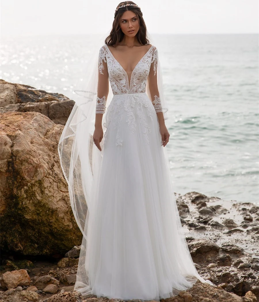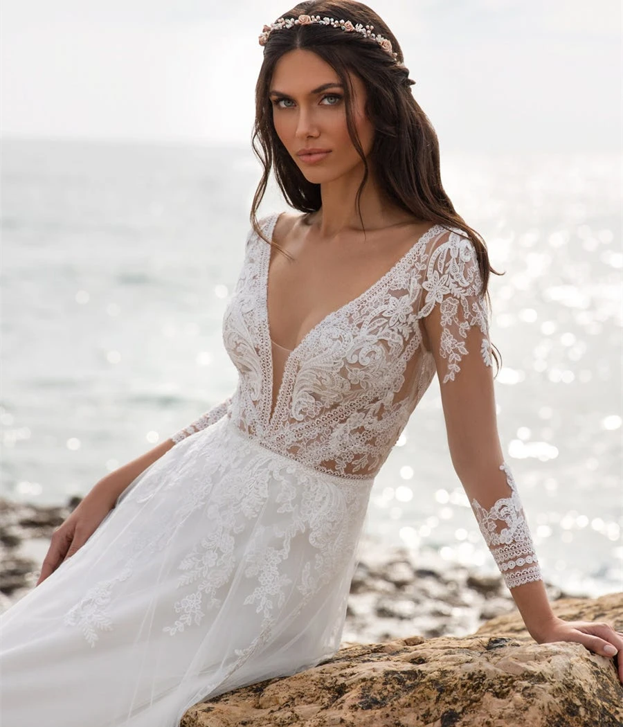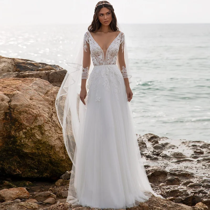 Пляжное свадебное платье в стиле бохо, длинные кружевные свадебные платья в пол с открытой спиной, рукавом 34 и V-образным вырезом, в богемном стиле, цвета слоновой кости