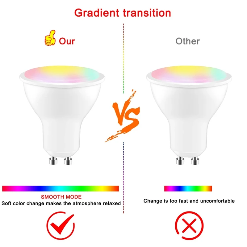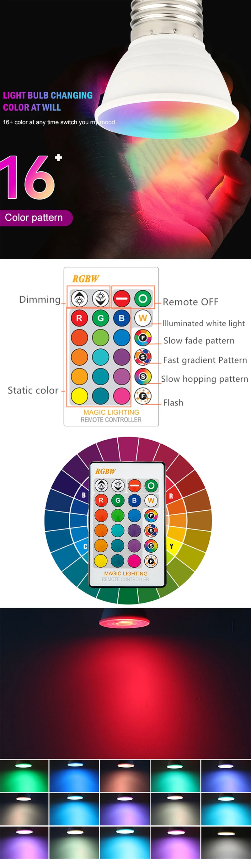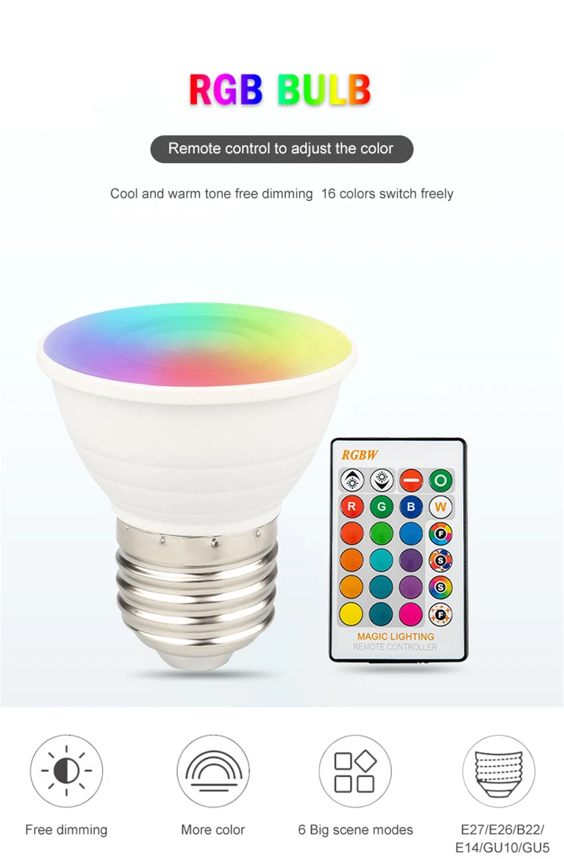 Тип интерфейса: GU10 E27 Светодиодный чип: высокомощный SMD 5050 Входное напряжение: AC85-265V Цвет: RGB + белый/RGB + теплый белый Функция памяти: включение/выключение лампы с помощью пульта дистанционного управления, доступна функция памяти лампы Рабочая температура: от-20 до 40 градусов