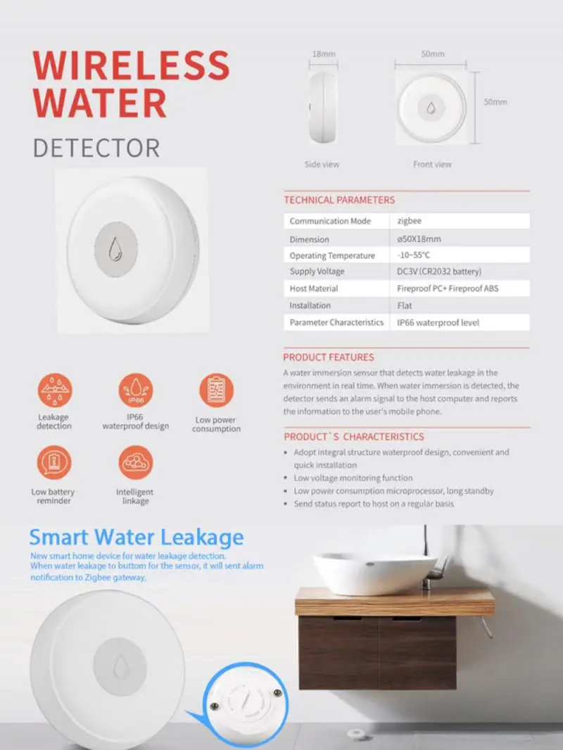 Датчик утечки воды Zigbee, беспроводной детектор наводнения датчик ...