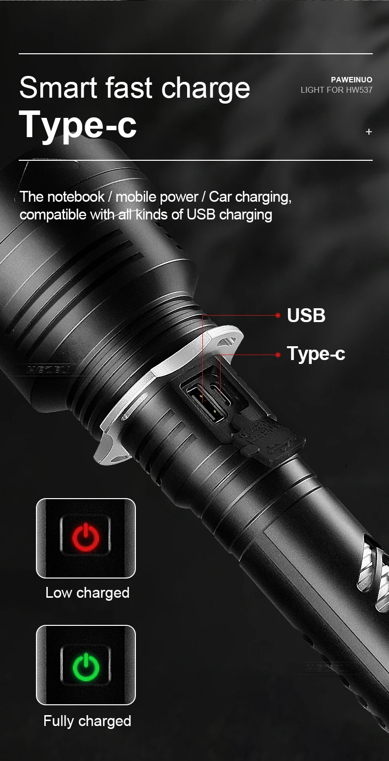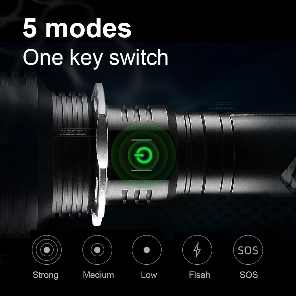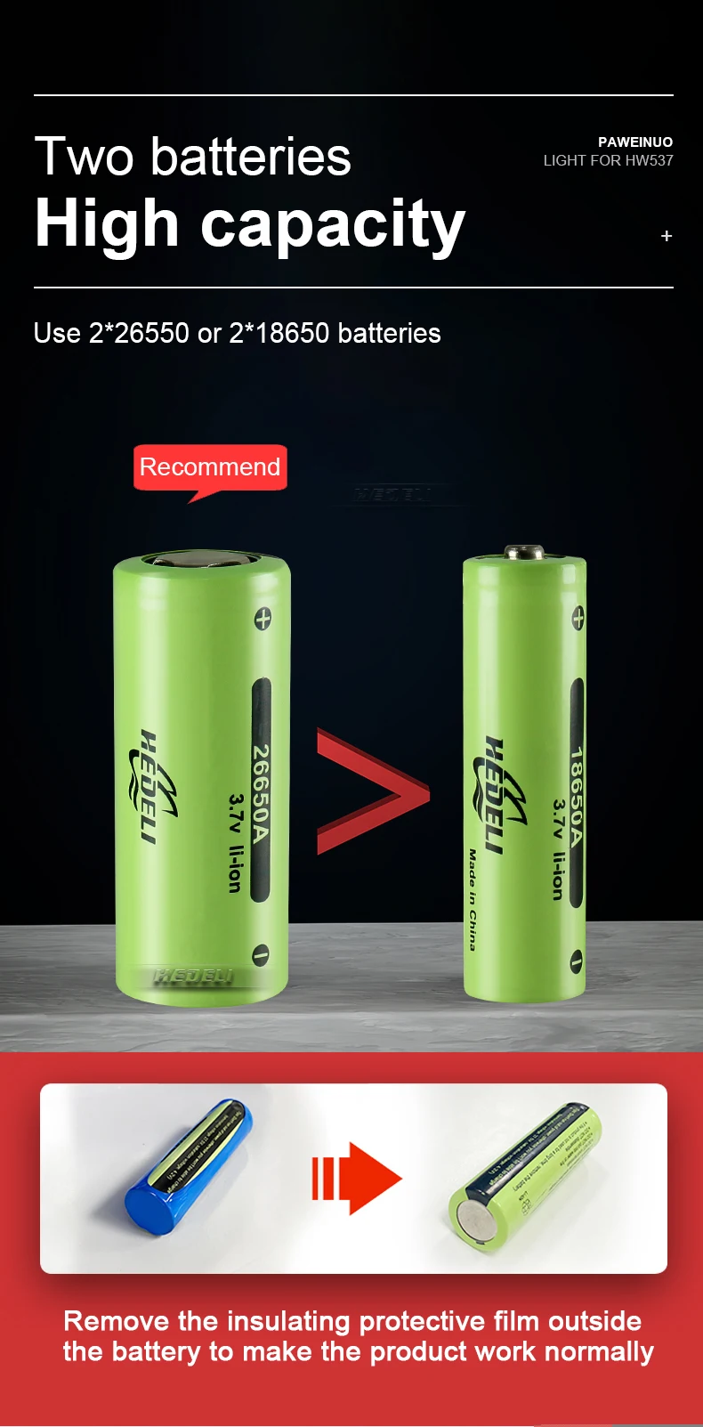 Характеристики продукта:Бренд: HEDELIНазвание продукта: HW537Модель шарика светодиодный Ной лампы: XHP170 LEDРежим: 5 режимов сильный-средний-низкий-Стробоскоп-SOS (Длительное нажатие для выключения)Диапазон: 700-1000 метровЦвет свечения: светильникТип аккумулятора: 2*18650 аккумуляторная батарея или 2*26650Время освещения: 5 -10 часов