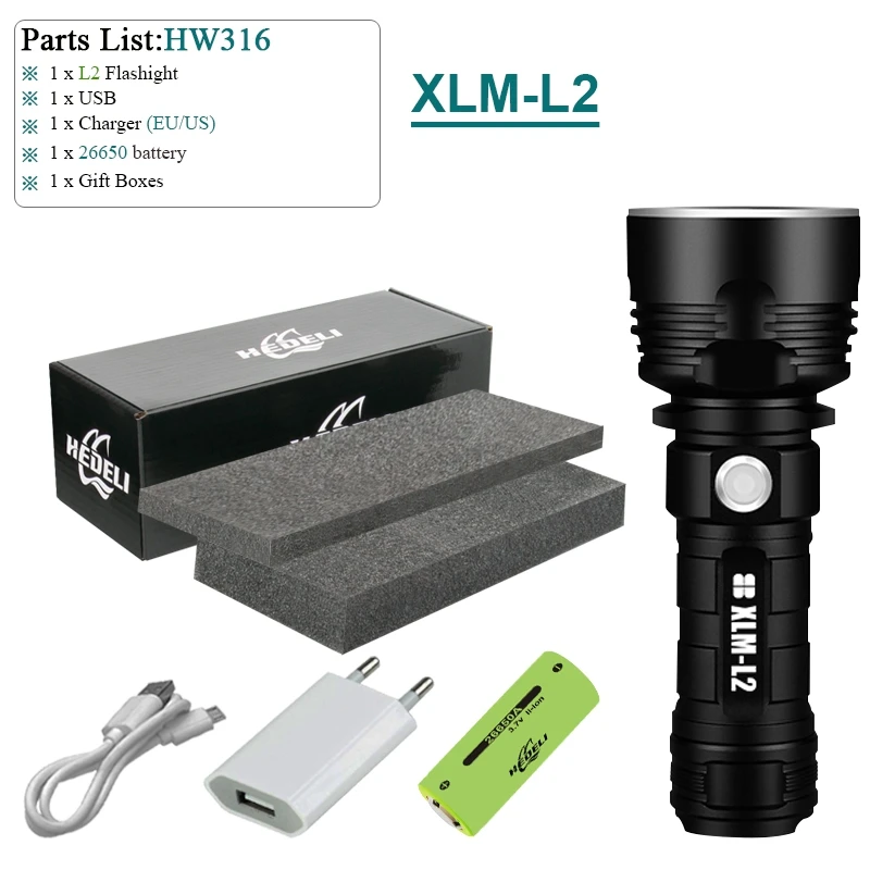 Параметры продуктаБренд: HEDELIНазвание продукта: HW516• Модель шарика светодиодный Ной лампы: XHM - L2• Режим: 3 режима сильный-средний-стробоскоп• Материал корпуса: алюминиевый сплав• Материал линз: выпуклая линза• Дальность: 450-800 метров• Цвет свечения: светильник• Тип аккумулятора: 1*18650 аккумуляторная батарея или 1*26650 аккумуляторная батарея большой емкости (не входит в комплект)• Время освещения: 6 часов (26650)• Вес нетто факела: 0,302 кг• Цвет свечения: светильник• Зарядное устройство: Micro USBВход: AC110-220V 47-63 Гц (компьютерный USB, автомобильный USB, USB-разъем для зарядки, зарядный фонарик)• Функция: отображение мощности※ Подходит для занятий спортом на открытом воздухе, работы, охоты, пеших прогулок, ночной езды, спелеологии, кемпинга, рыбалки и т. д.