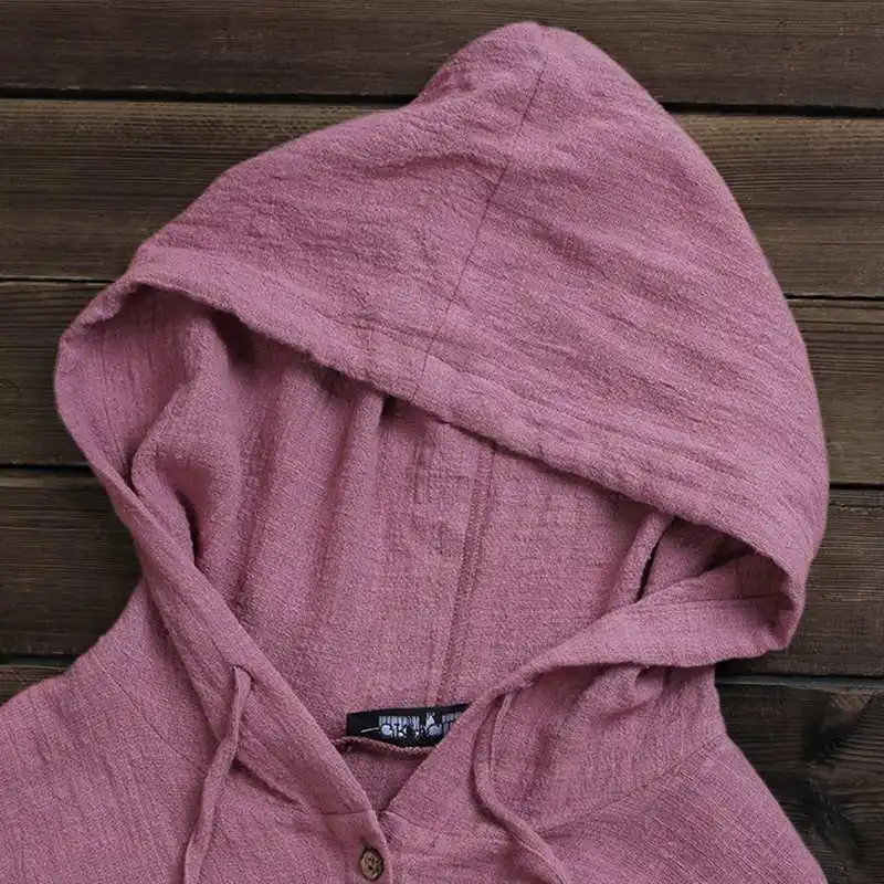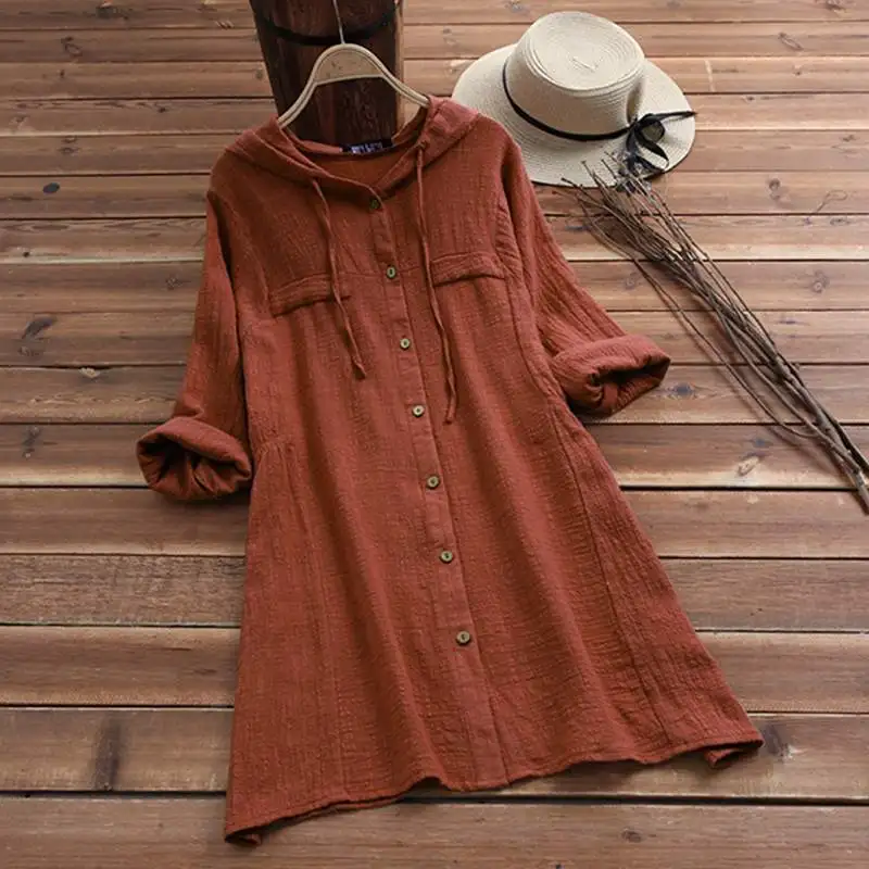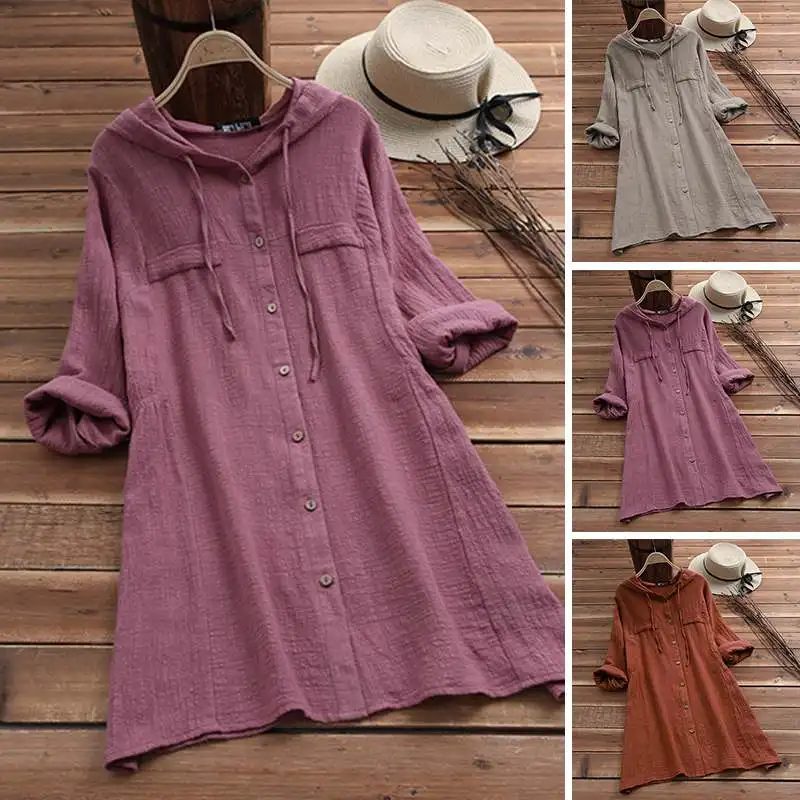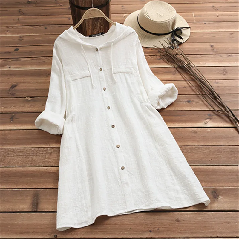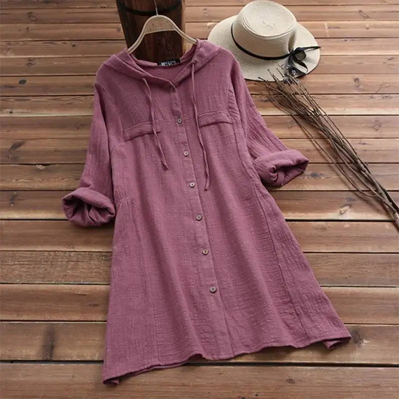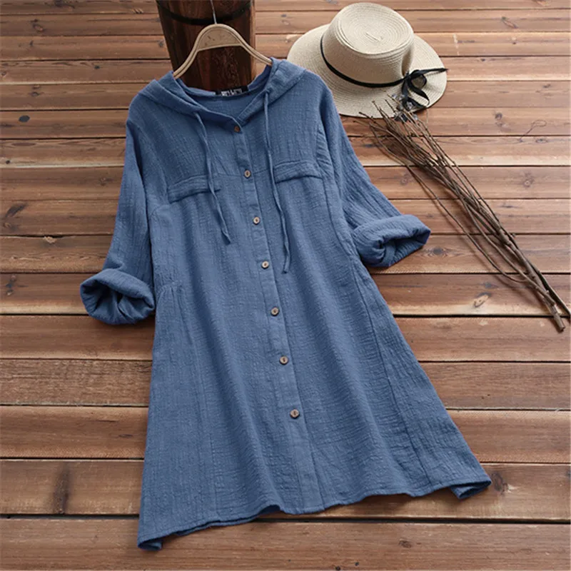 Винтажные Топы с капюшоном, женские весенние Рубашки ZANZEA 2022, повседневные блузы на завязках с длинным рукавом и пуговицами, Женская однотонная туника