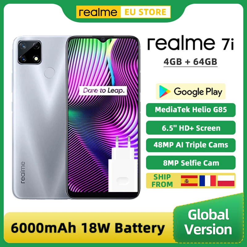 Модель --------- realme 7iВнимание ----- глобальная версия, поддержка нескольких языков и Google play store.Игровой процессор MediaTek Helio G85 Octa CoreЭкран --------- 6,5 ''Full Screen Mini-drop, HD + дисплейOS -------------- Realme UI (на базе Android 10)RAM + ROM ---- 4 Гб RAM + 64 Гб ROMКамера -------- 48MP + 8MP + 8MP AI Тройная задняя камера, 8MP селфи-камераАккумулятор ------- 6000 мАч (тип), быстрая зарядка 18 Вт Type-CОтпечаток пальца ---- да, отпечаток пальца сзадиБеспроводная сеть ---- 2,4/5 ГГц; 802,11 b / g / n / a / ac;Bluetooth 5,0Навигация ----- GPS / A GPS, Beidou, GlonassСеть ---- 2 слота для SIM-карт + 1 слот для microSDПожалуйста, посетите этот веб-сайт, чтобы проверить его https://www.частоGSM:850/900/1800/1900WCDMA:1/2/4/5/8FDD-LTE:1/2/3/4/5/7/8/20/28TD-LTE:38/40/41 (2535-2655 МГц)Что в коробке?Сотовый телефон realme x1Защитная пленка (предварительно загружена) x1Зарядное устройство 18 Вт x1Извлечение сим-карты инструмент x1Кабель USB Type-C x1Важный информационный буклет с гарантийным талоном x1